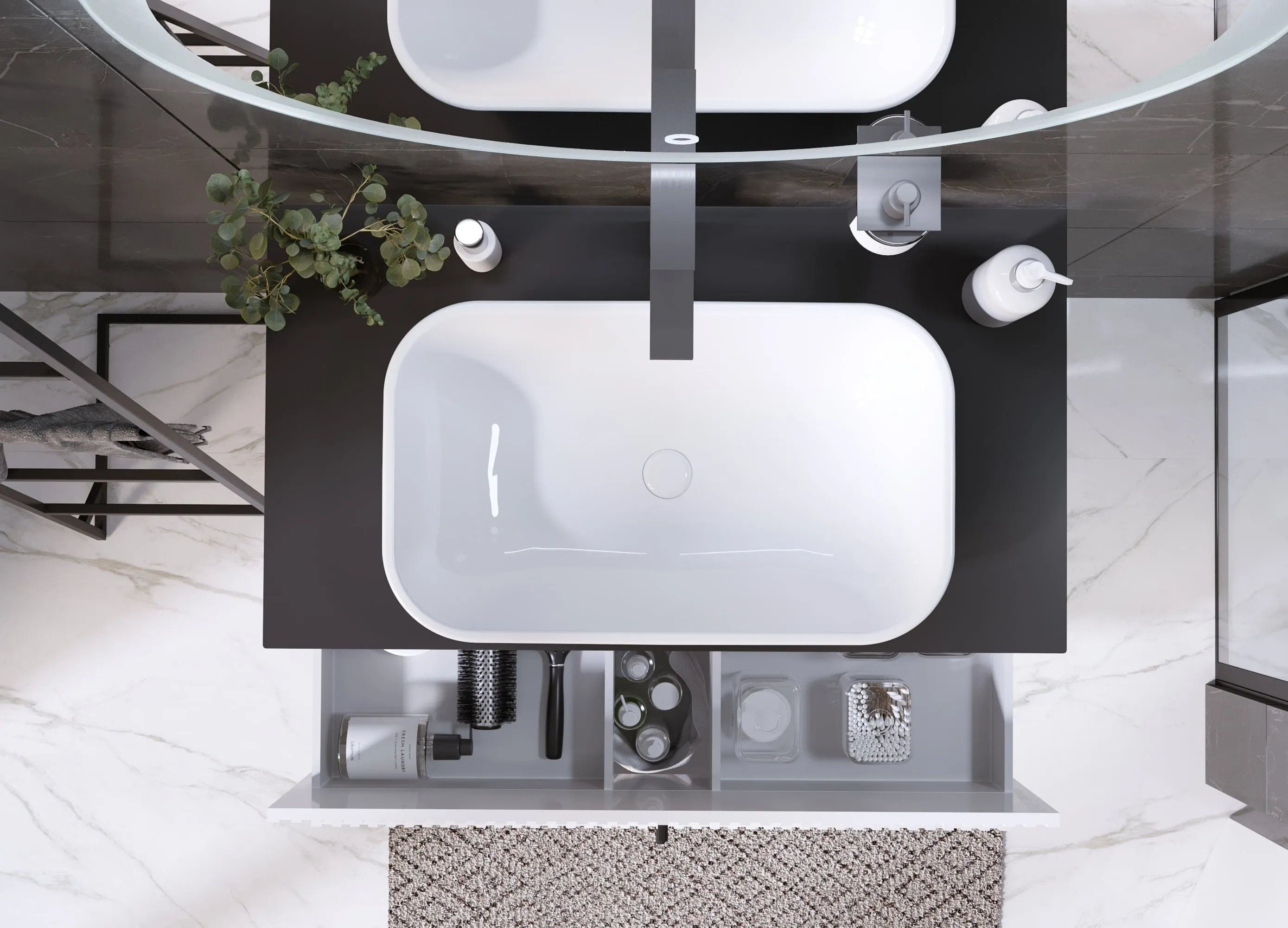 В выдвижных ящиках поместятся все необходимые принадлежности: средства личной гигиены, косметика, даже бытовая химия.