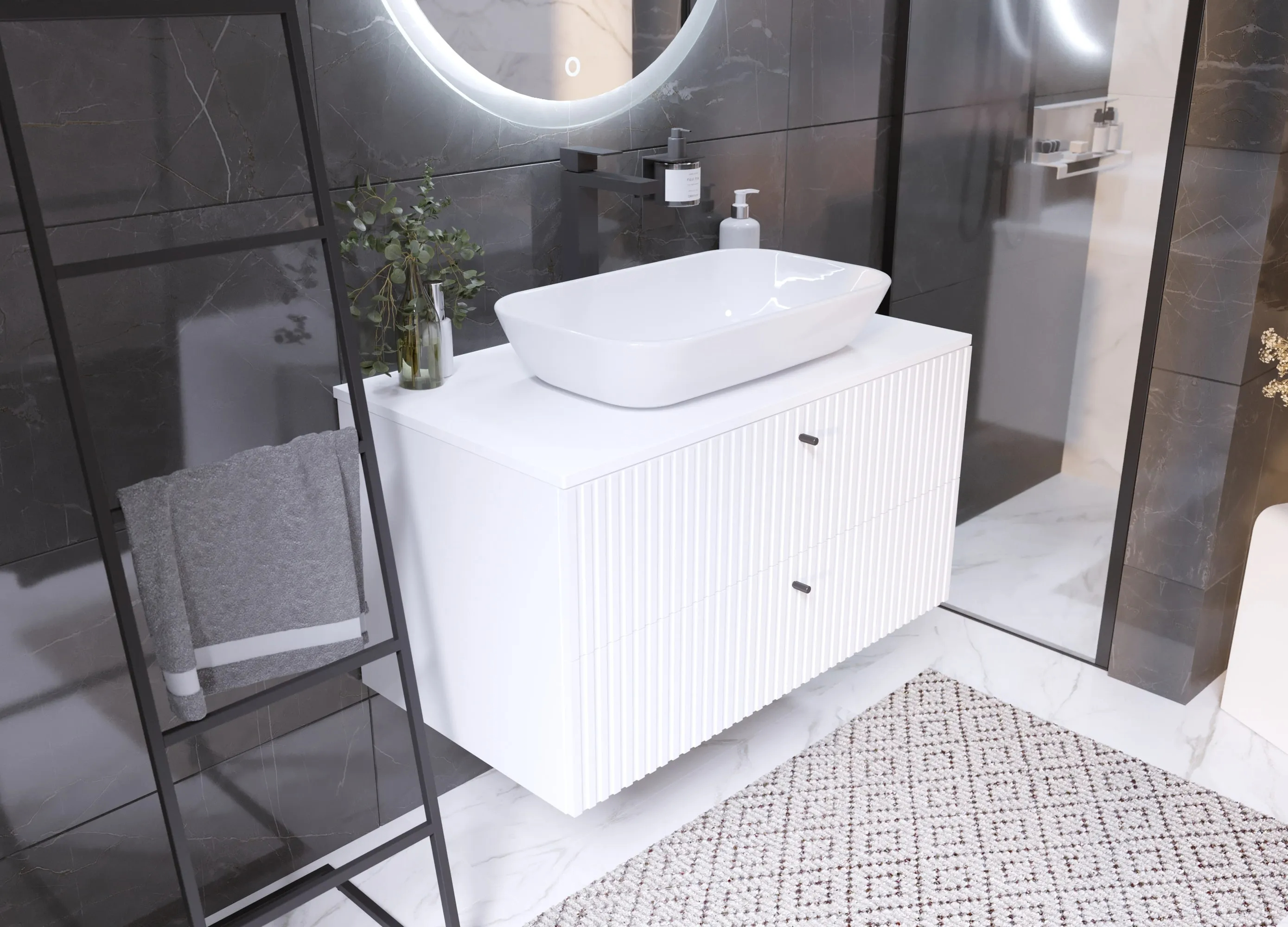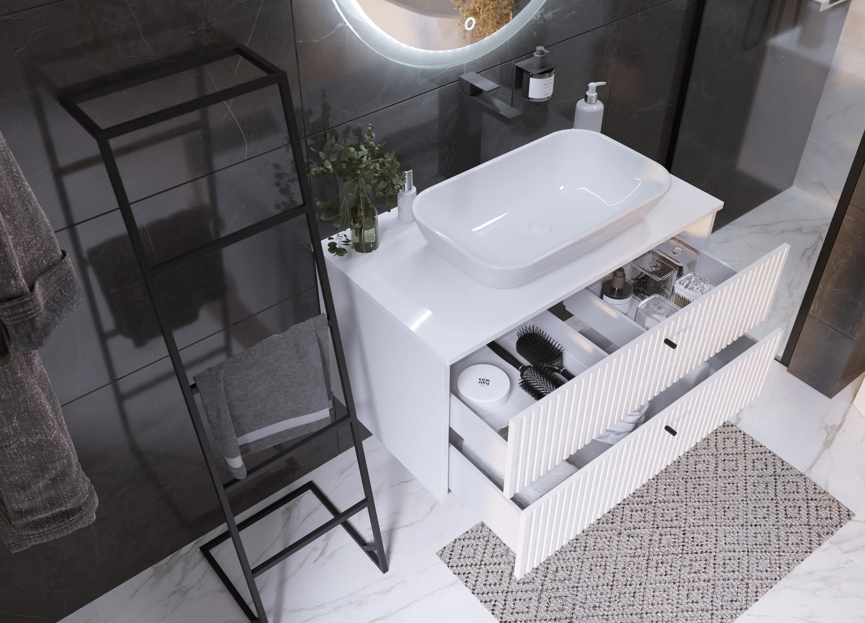 Тумба Desire – изящное решение для интерьера ванной комнаты. Рельефный фасад создает ритмичную игру света и теней. Черные ручки-кнопки контрастируют с белым фасадом и подчеркивают её современный дизайн.
