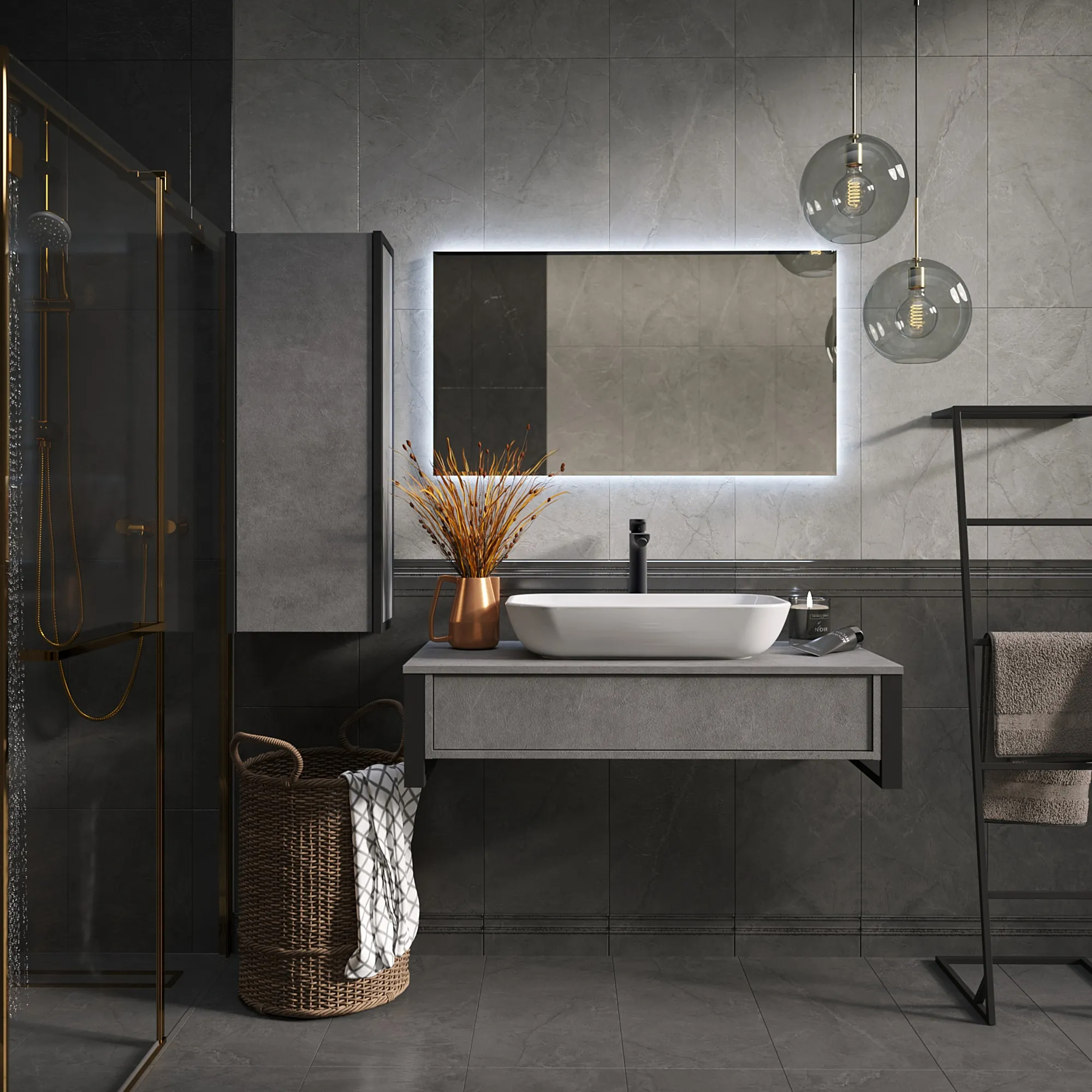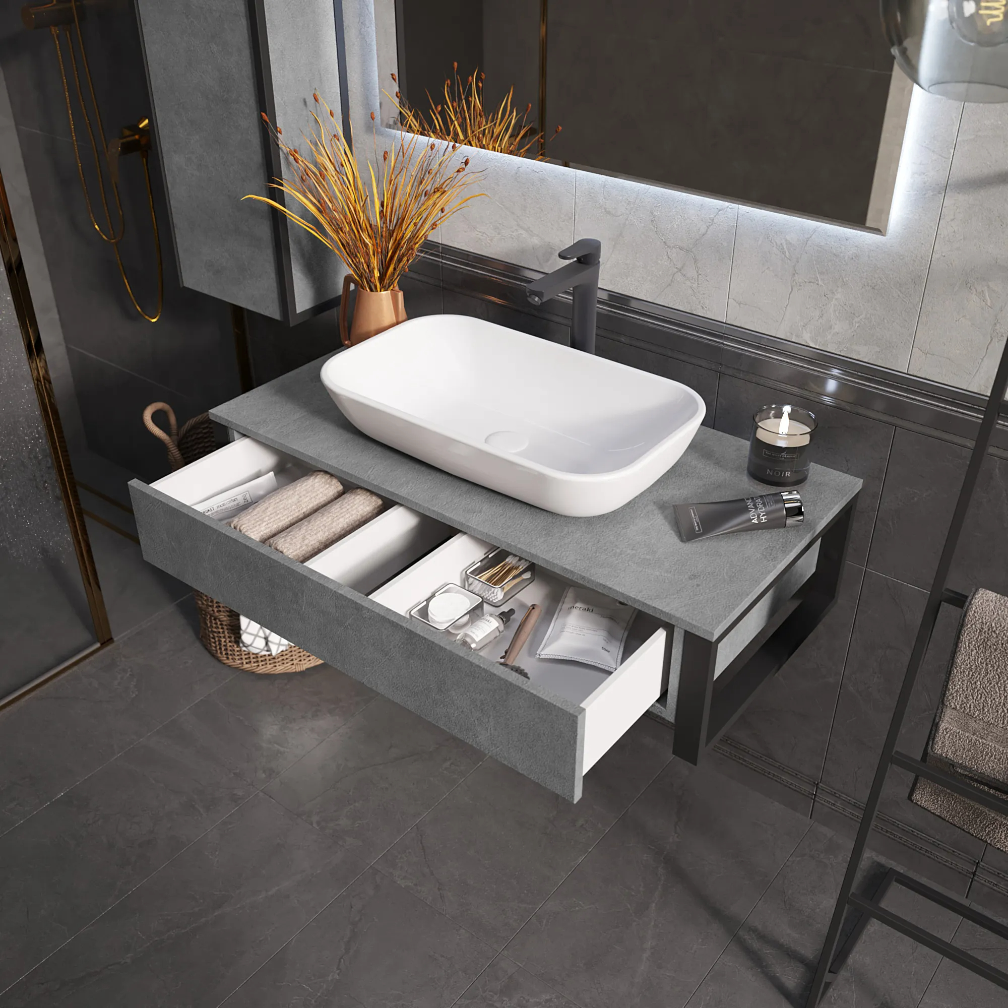 Подвесная тумба GRUNGE LOFT под накладную раковину в стиле лофт – стильное и практичное решение для современного интерьера. Игра текстур и оттенков бетона с металлическими деталями придает ванной особый характер, наполняя пространство неповторимой динамикой и энергией.