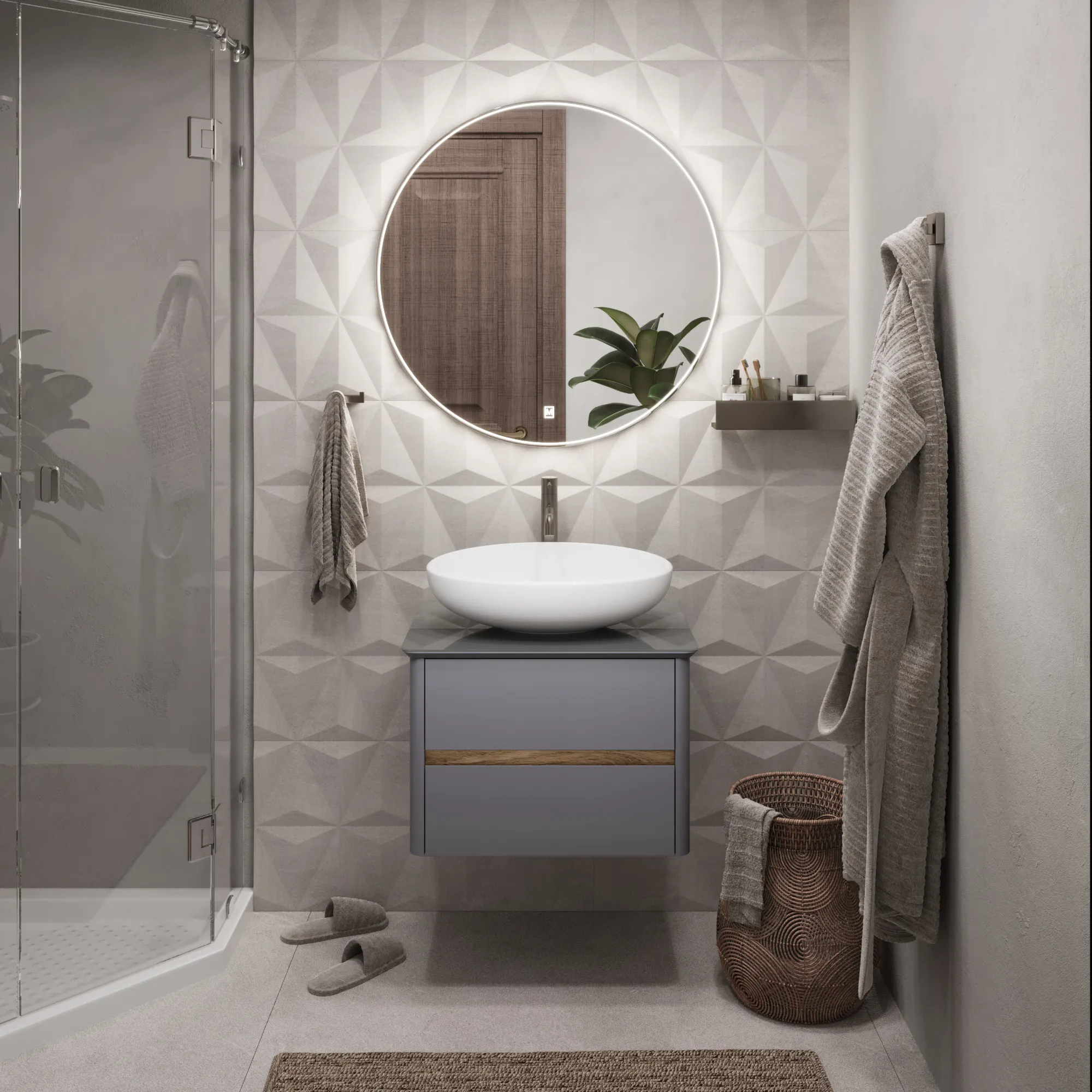 Матовый фасад, интегрированные ручки, стеклянная столешница и полки в тон теплому дереву придают интерьеру изящность и подчеркивают его уникальный характер. Трендовый серый цвет освежает интерьер, делая его совеременным и мягким, а тумбу подходящей для большинства интерьеров ванной комнаты.