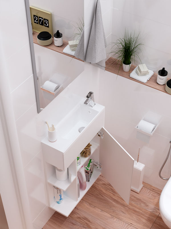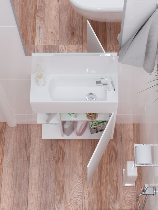 - Тумба с раковиной в современном стиле. Во всех смыслах утонченная мебель идеально подойдет в гостевой санузел или маленькую ванную комнату. Корпус и фасады тумбы выполнены из МДФ, облицованы глянцевой ПВХ пленкой белого цвета. Минималистичный дизайн без ручек: открывание от захвата. Петли на дверце с доводчиками.