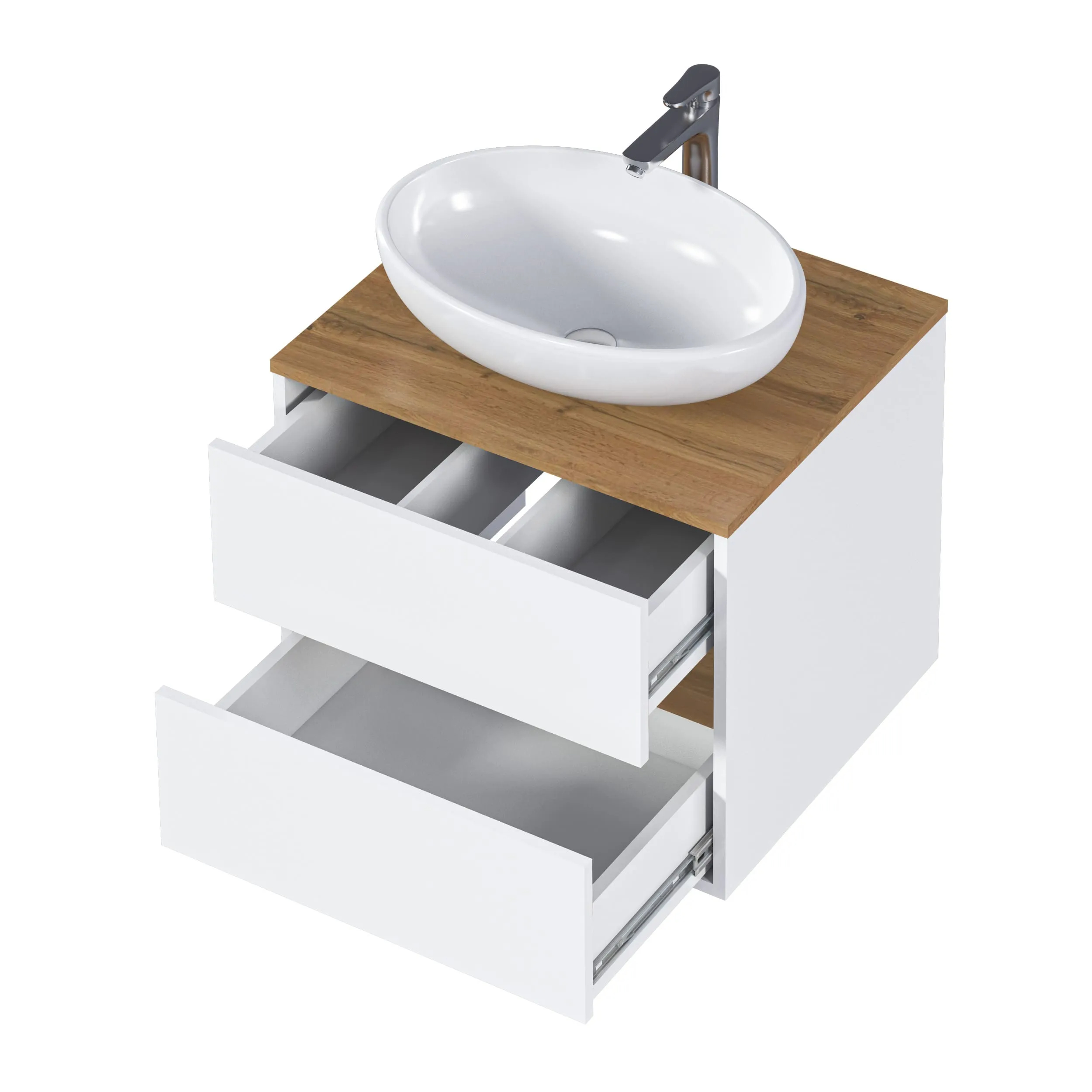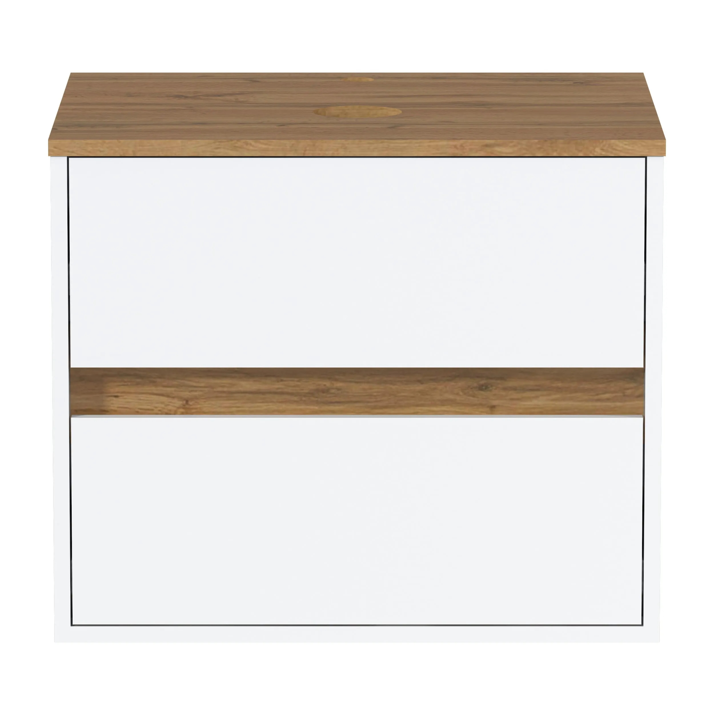 Подвесная тумба Veil – минималистичная модель, созданная по актуальным тенденциям мебели для ванной. Благодаря своей универсальности, она подходит как для классических, так и для современных интерьеров. Столешница и перегородка в тон теплому дереву придает интерьеру уют и естественность, а белый матовый фасад и корпус добавляют легкости в пространство.