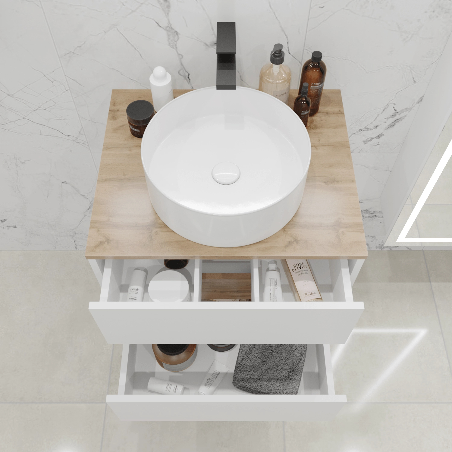 • Выдвижные ящики предлагают место для комфортного хранения необходимых предметов, таких как косметика и аксессуары, средства ухода.
