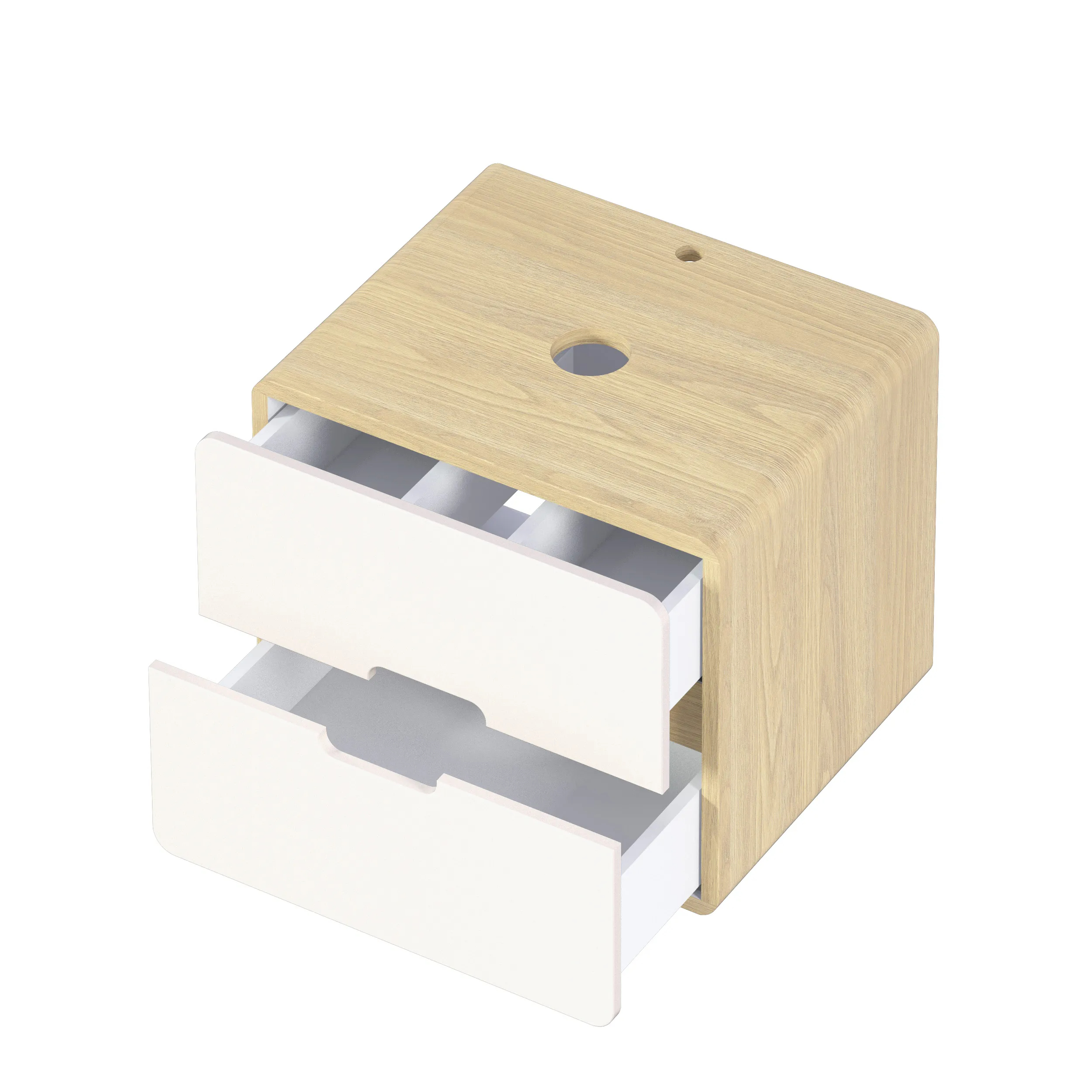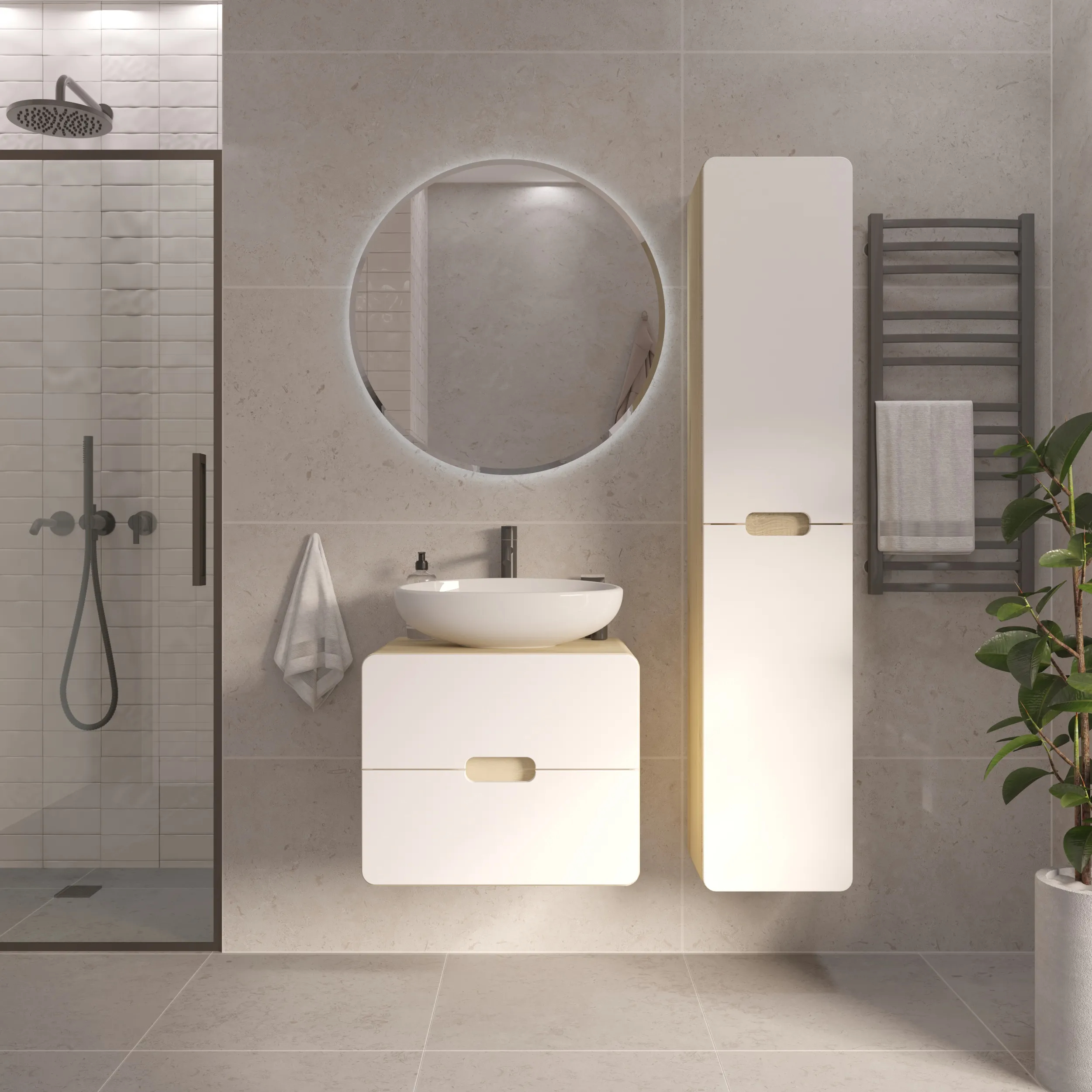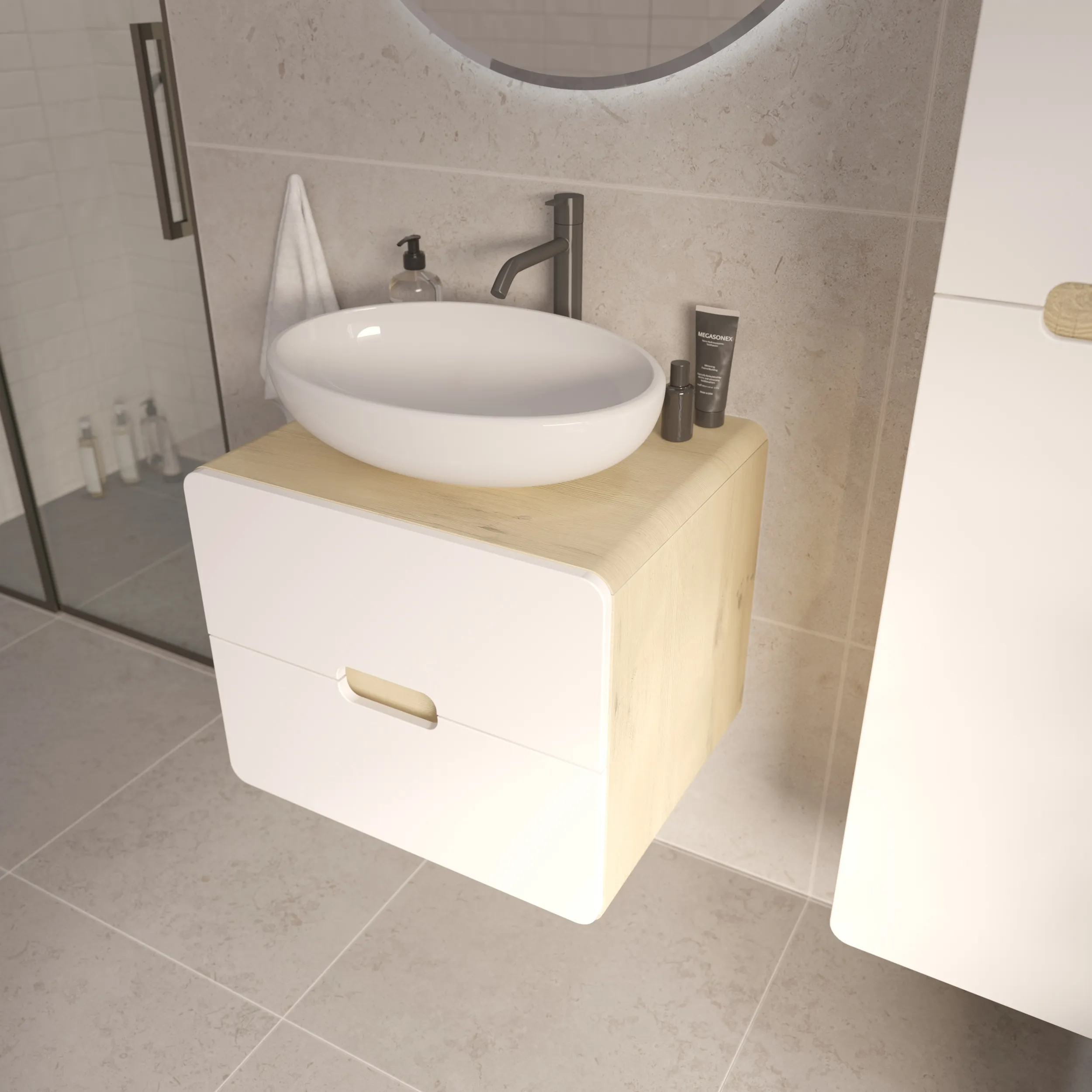 Подвесная тумба под накладную раковину – современное минималистичное решение для ванной. Плавные скругленные края, белый фасад с древесным корпусом символизируют гармонию, создают ощущение легкости и безопасности. Это особенно актуально в ванной комнате, где важно чувствовать себя комфортно и расслабленно.