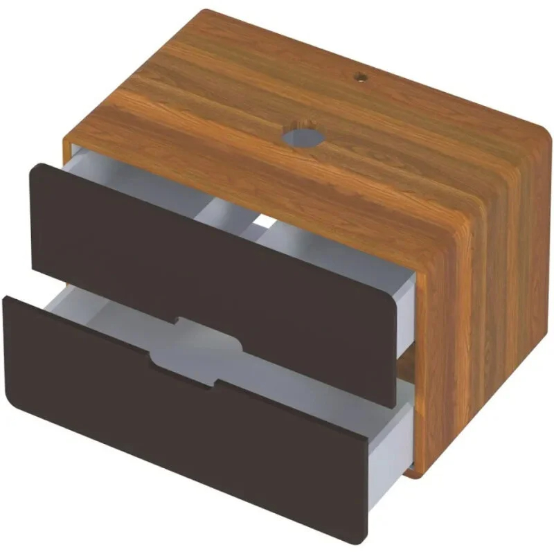 • Материал фасада и корпуса тумбы под дерево – МДФ, покрытый пленкой ПВХ, а ящики из влагостойкой ЛДСП. Благодаря этому модель сохранит первозданный вид в условиях повышенной влажности.