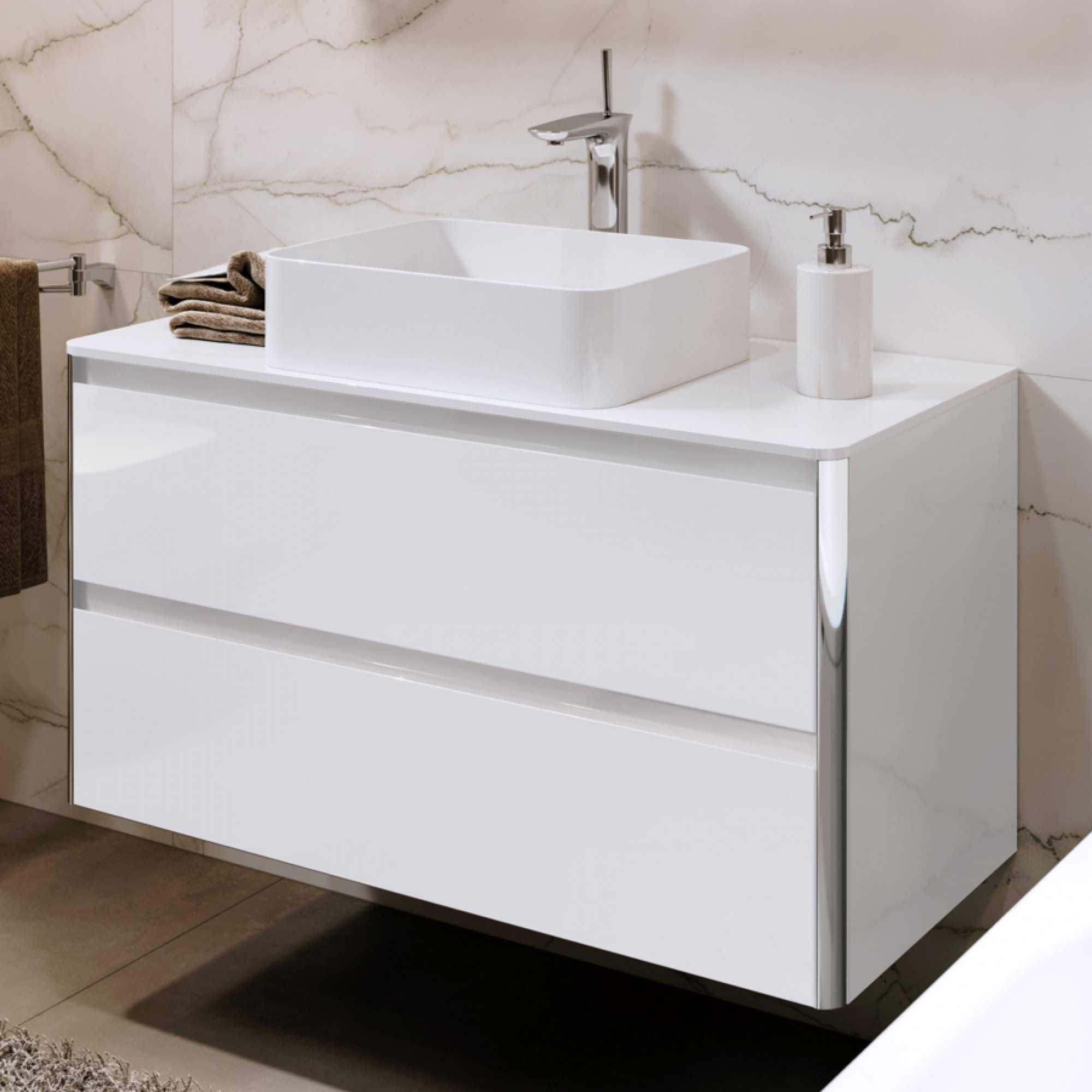 Подвесная тумба в ванную выполнена из качественных материалов. Для изготовления корпуса применяется влагостойкая ЛДСП. Фасады и боковые стенки выполнены из прочной МДФ, крашенной белой глянцевой эмалью. Ширина тумбы ( размер 100 ) позволяет разместить возле мойки банные принадлежности (полотенце, косметические средства и т.д.). Красиво смотрится столешница из искусственного камня, в которую врезается умывальник.