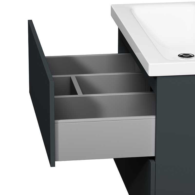 Фурнитура push-to-open - открывание ящика нажатием на фасад. Ящики с антискользящим покрытием цвета антрацит – европейский стандарт.