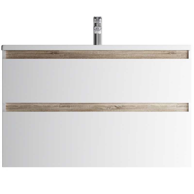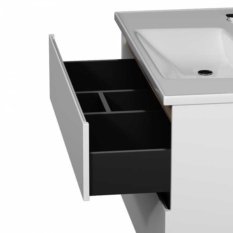 Функциональный органайзер в первом ящике позволит хранить необходимые косметические средства под рукой и в полном порядке. Внутреннее покрытие каждого ящика выполнено в современном цвете Anthracite и имеет противоскользящее покрытие. Встроенная керамическая раковина белоснежного цвета оснащена специальным бортиком для защиты от пролива воды за мебель.
