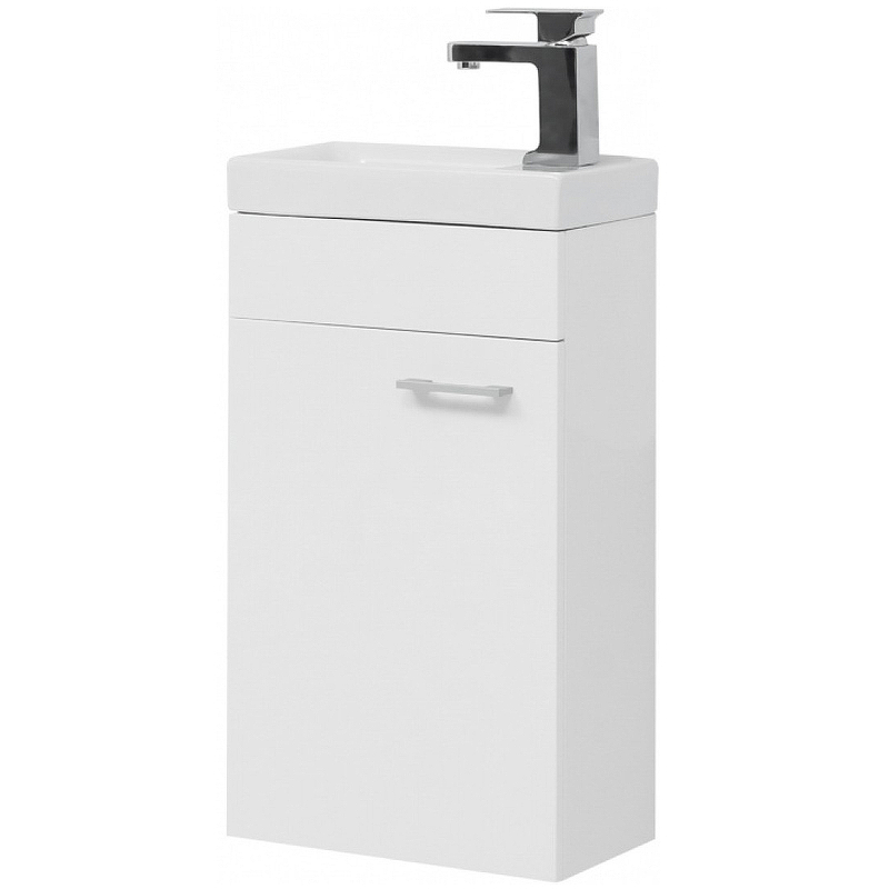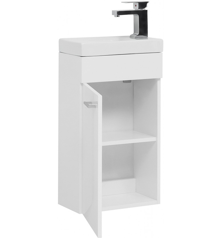 Тумба с раковиной Aquanet «Нота» 40 L (Moduo) — компактная модель белого цвета с левосторонней ориентацией, которая подойдет для обустройства небольшой ванной комнаты или санузла. Монтаж настенный, что облегчает уборку напольного покрытия. Корпус сделан из устойчивой к воздействию влаги ЛДСП, фасады — из МДФ. За распашной дверцей, дополненной серебристой ручкой, располагается одна полка для хранения. На тумбу устанавливают раковину Cersanit Moduo 40 S-UM-MOD40/1. Корпус изготовлен из белоснежного фарфора, не вызывающего сложностей при уходе. Материал экологичен и безопасен. Габариты — 400х220х155 мм. Для очищения поверхностей используют влажную ткань и средства бытовой химии, не содержащие абразивные частицы. Рекомендуем дополнить раковину хромированным смесителем от производителя Allen Brau из коллекции Infinity (артикул 5.21001-00).