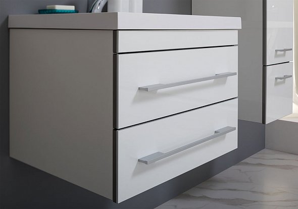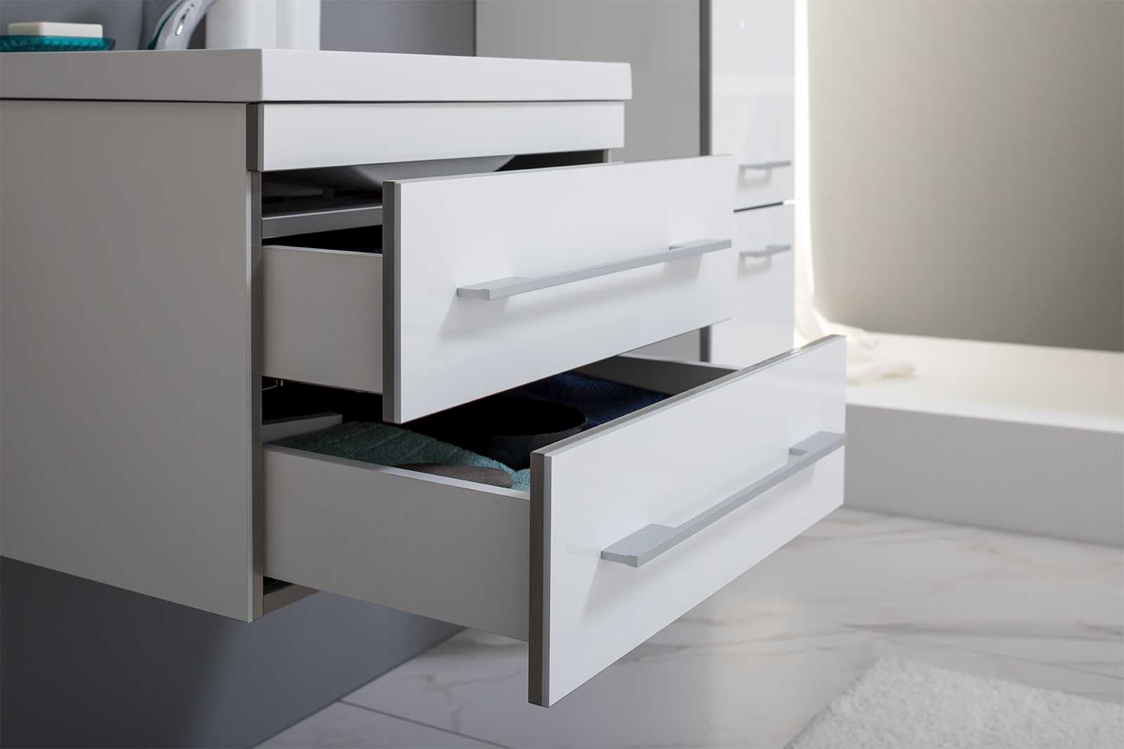 - Модель оснащена двумя вместительными выдвижными ящиками с механизмом доведения для удобного хранения всех необходимых принадлежностей для ванной.