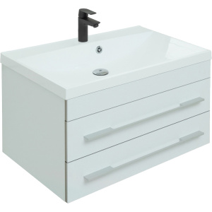 Тумба с раковиной Aquanet «Верона» 75 New — это комплект, выполненный в белом матовом цвете в стиле модерн. Мебель подвешивают с помощью дюбелей. Она оснащена двумя широкими ящиками с длинными ручками с хромированным покрытием. Внутреннее пространство спроектировано таким образом, чтобы при закрывании не повреждался слив. Корпус изготовлен из МДФ, устойчивой к высокому уровню влажности. Мойка дополнена отверстием для смесителя. Вдоль стены располагается бортик, на котором можно разместить стакан с щетками и зубной пастой, мыльницу или дозатор. Для ухода за поверхностью рекомендуется использовать мягкую влажную ткань, губку и неабразивные средства бытовой химии. Размеры — 750х480х445 мм. Дополнить набор можно навесным зеркалом De Aqua «Сильвер» (артикул 00261663), донным клапаном (артикул 5.21026-31) или смесителем (артикул 5.21001-00) от Allen Brau.