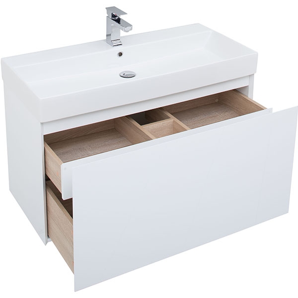 Тумба с раковиной Aquanet Йорк 100 кажется довольно-таки простой внешне, но за видимой простотой кроется тщательная работа над каждой линией, над каждой деталью. Обратите внимание на интегрированную ручку, которой по сути не видно, но при открывании выдвижного ящика она поражает удобством использования. Радует глаз зеркальная чистота глянцевой поверхности фасада из МДФ. Мебель белоснежная. Цветовой акцент появляется при выдвижении ящика тумбы, так как внутренние детали сделаны в цвете «дуб сонома». Сочетание выглядит благородно и эстетично, при этом не изменяя общей идее лаконичности во всем. Ящик в тумбочке один, но внутри него прячется еще одна зона хранения, в которой можно разложить по местам разнообразные мелочи. В системе выдвижения использована фурнитура немецкого производителя Hettich. Тумба шириной 100 см комплектуется керамической раковиной Sanovit. Она может быть как подвесной, так и напольной – на выбор покупателя. <