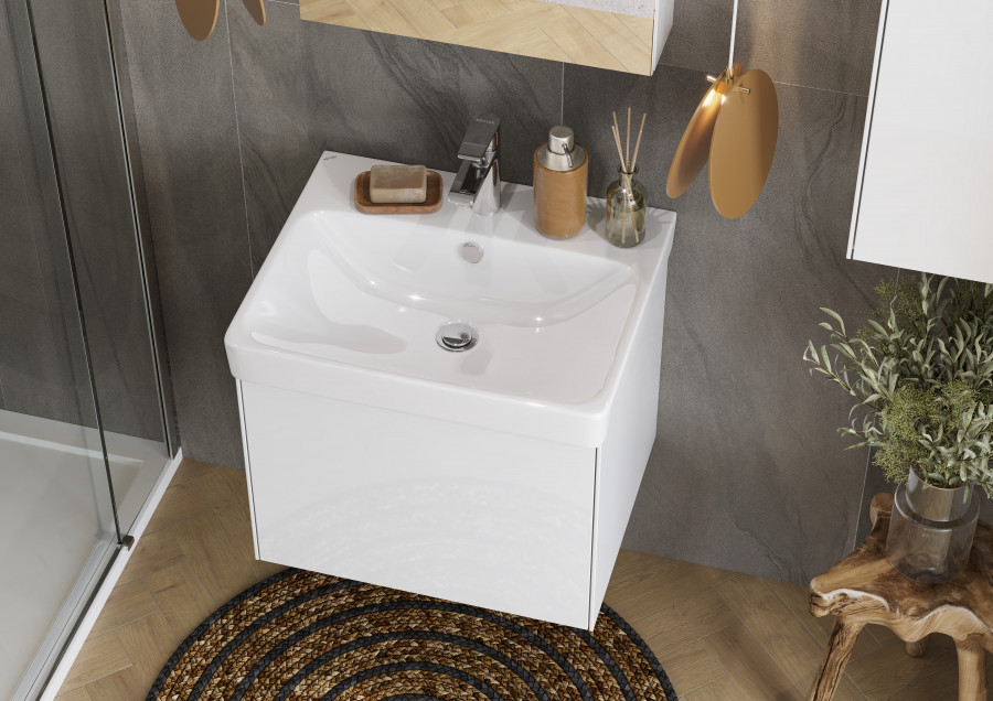 Боковые стенки тумбы под раковину АСТИ 55 выполнены из влагостойкой ЛДСП в матовой покраске, фасад тумбы из влагостойкой ДСП в белой глянцевой покраске. Трендовое сочетание двух текстур позволит интересно обыграть классический белый цвет и разнообразить мебелью АСТИ дизайн любой ванной комнаты. Ящик тумбы оснащен механизмом Push-to-Open, гарантирующим плавное открывание и закрывание. Внутренняя отделка ящика выполнена в цвете лён: приятная на ощупь и предотвращает скольжение предметов. Отличительная особенность мебели из коллекции - боковые стенки, при изготовлении которых используется особая инновационная технология. Благодаря ей создается эффект визуально тонких боковых линий, однако конструкция при этом остается надежной и прочной. Пространство для хранения в ящике тумбы можно организовать так, как удобно именно вам. Тумбы АСТИ комбинируются с раковиной Адриана бренда Santek.