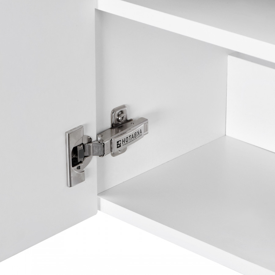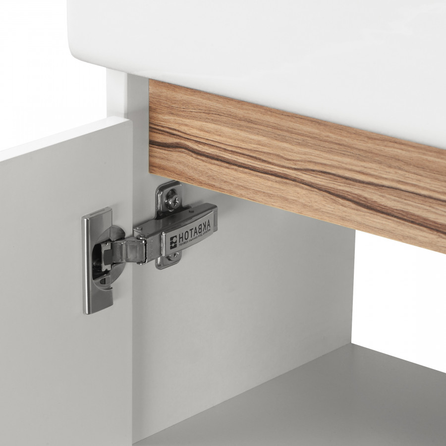 Левосторонняя тумба Эклипс М от AQUATON позволит грамотно организовать небольшой санузел или ванную комнату. Корпус у данной модели комбинированный и изготовлен из текстурированной ДСП в эффектной светлой отделке эбони и из влагостойкой ЛДСП, покрытой глянцевой белой краской. Фасад, выполненный из МДФ, также окрашен в белый глянец. Минималистичный дизайн тумбы подчеркивает отсутствие лицевой фурнитуры. Плавное закрывание распашного фасада-створки обеспечивают петли с доводчиком. Для комплектации тумбы Эклипс М подойдет компактная, но при этом глубокая прямоугольная керамическая раковина Santek Эрис 46. Расположение смесителя на раковине с правой стороны, петли на тумбе с левой стороны.