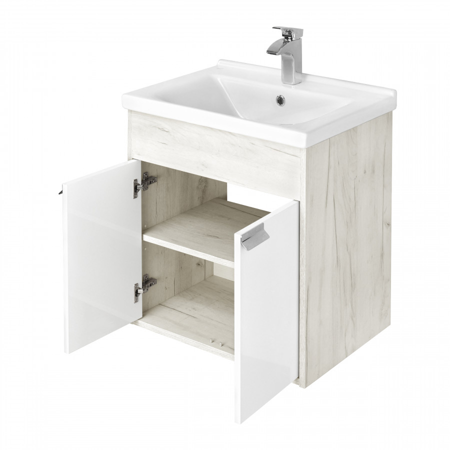 Тумба Флай 60 в современном стиле сочетает в себе два цвета - белоснежный глянец и трендовый декор дуб крафт. Выполненная из влагостойкой ламинированной плиты тумба обладает простым и удобным функционалом: за распашными фасадами-створками находится вместительное отделение с регулируемой по высоте полочкой. Фасады открываются с помощью изящной и оригинальной ручки от европейского производителя (Испания), петли снабжены доводчиками. Тумба комплектуется белоснежной прямоугольной керамической раковиной Миранда бренда Santek. Фасады тумбы окрашены полиэфирной краской ультрафиолетового отверждения. Такой способ окрашивания обеспечивает изделию привлекательный внешний вид, а также износостойкость и долговечность.