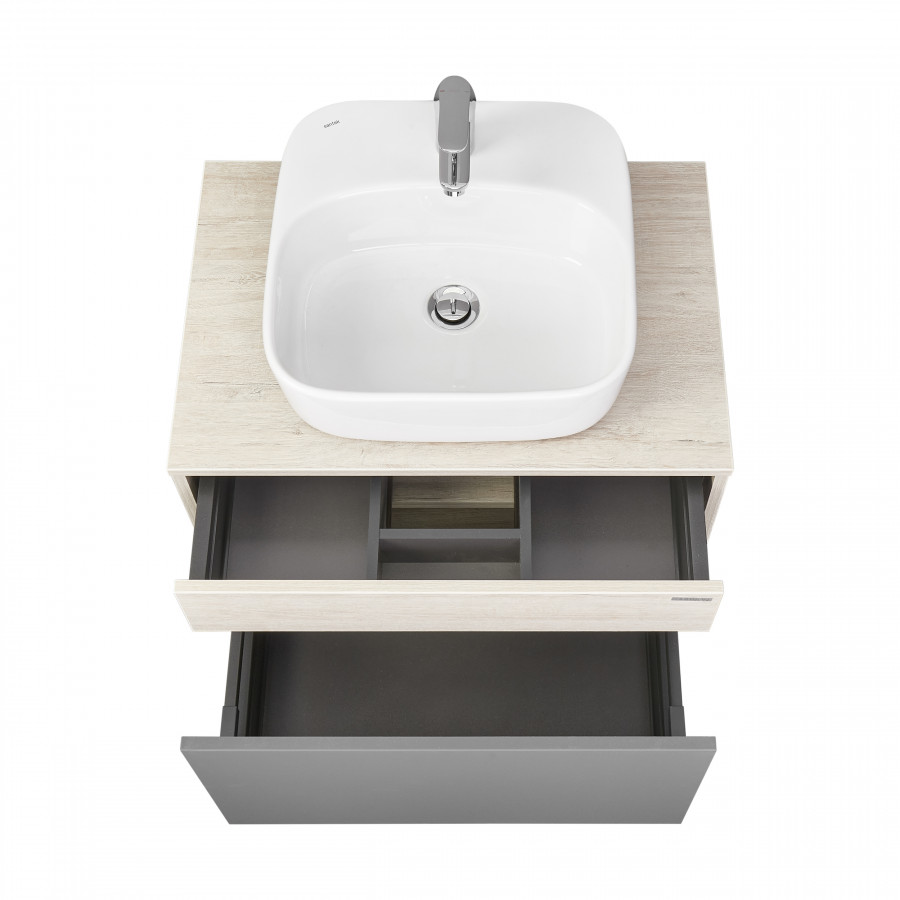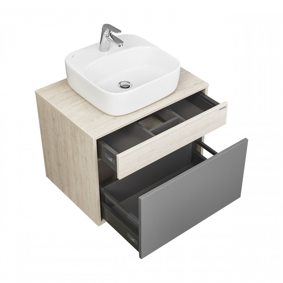 Модуль 65 коллекции Лофт Урбан функционально состоит из двух ящиков полного выдвижения. Верхний ящик тумбы комплектуется внутренней организацией пространства: в нем очень удобно хранить небольшие аксессуары и принадлежности. Вместительный нижний высокий ящик подойдет для более крупных предметов. Функция полного выдвижения ящиков и система открывания push-to-open делают использование тумбы особенно комфортным. Подвесной модуль может комплектоваться различными по размеру и дизайну металлическими черными опорами, высокими и низкими, которые крепятся непосредственно под модуль, кроме того, доступен вариант установки модуля и без опор. Корпус тумбы выполнен из влагостойкой ламинированной ДСП в цвете дуб орегон с текстурой натурального дерева, выгодно подчеркнутым фасадами из МДФ в пленке антрацит с эффектом soft touch.