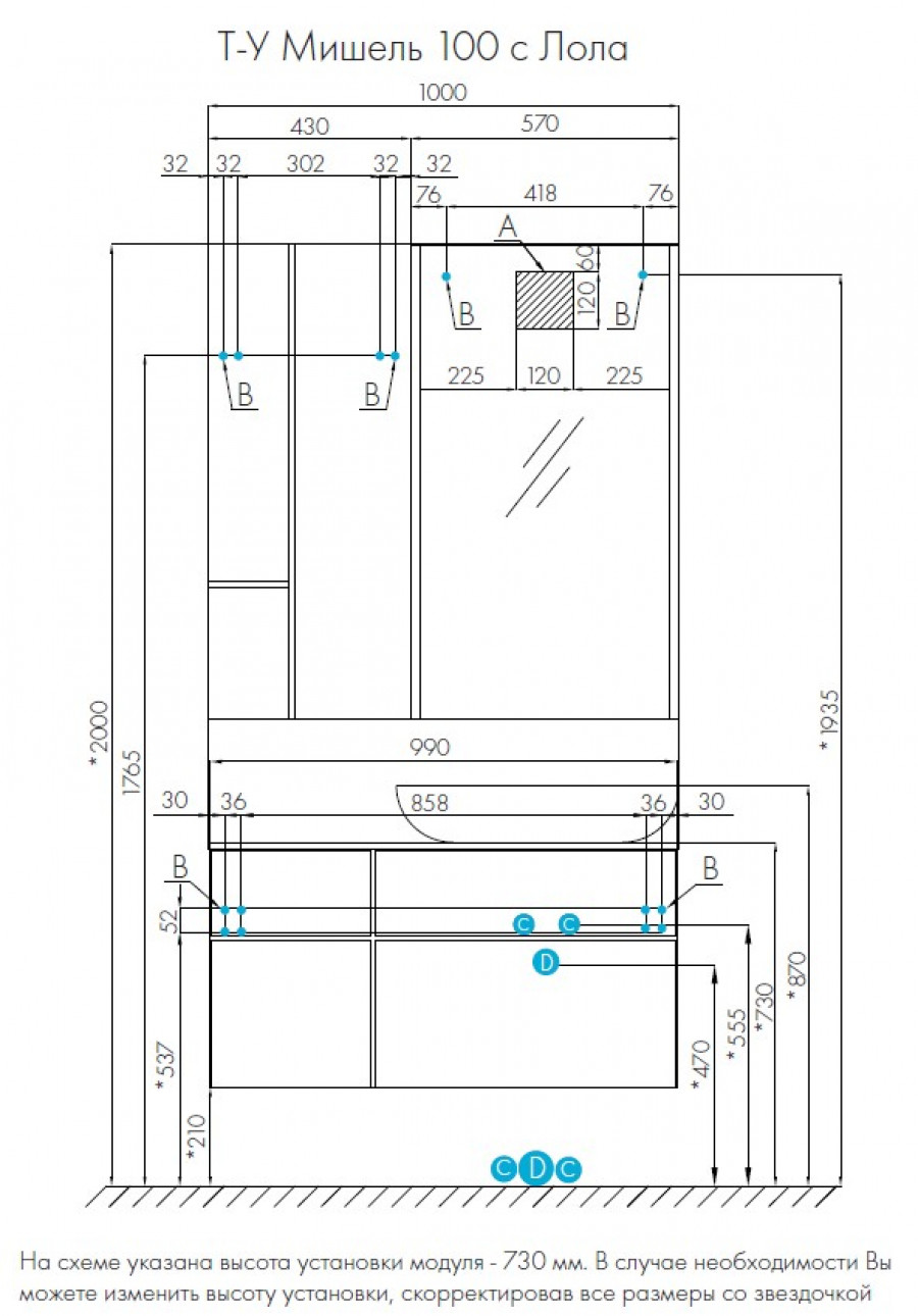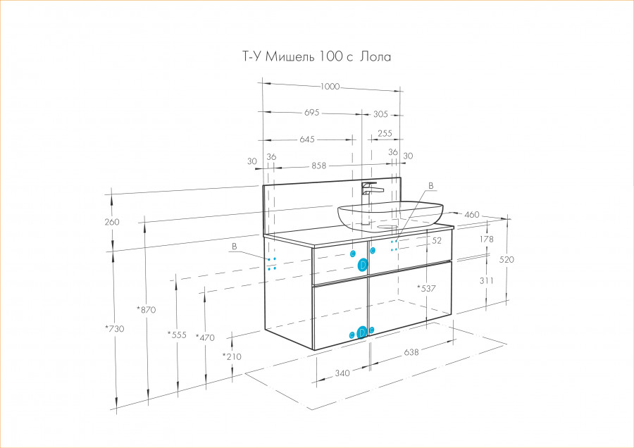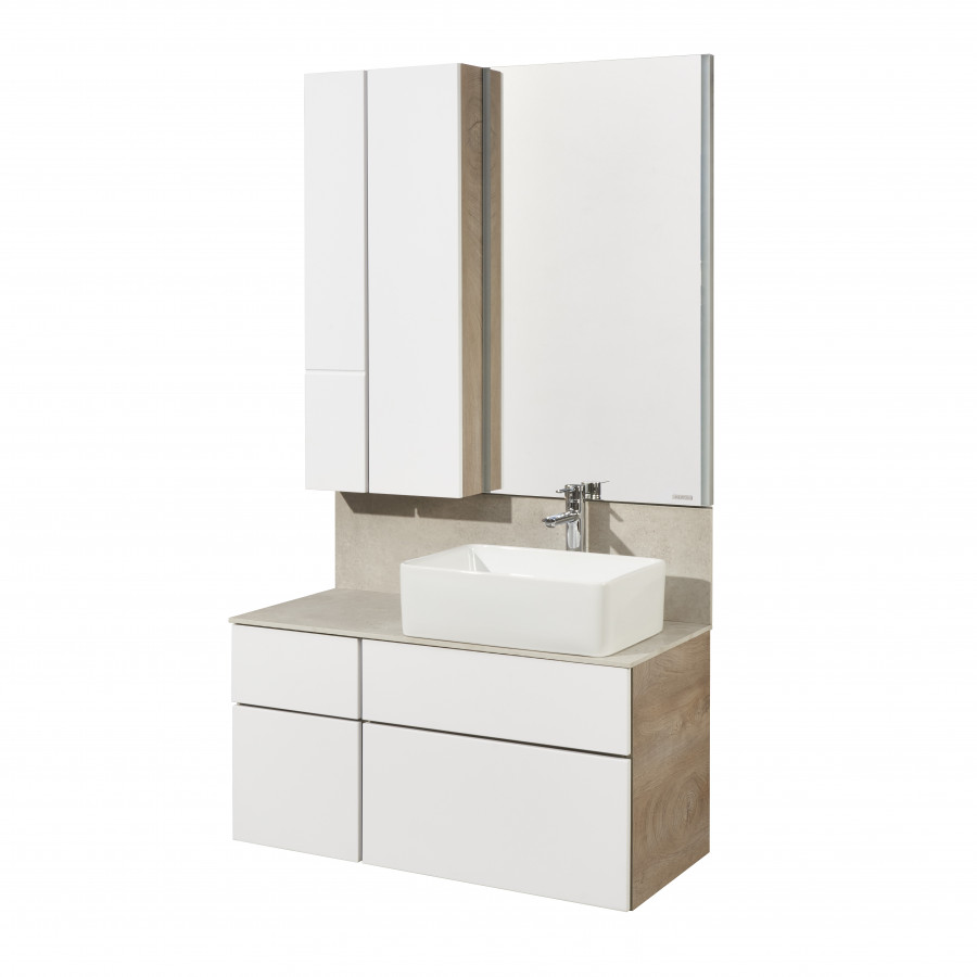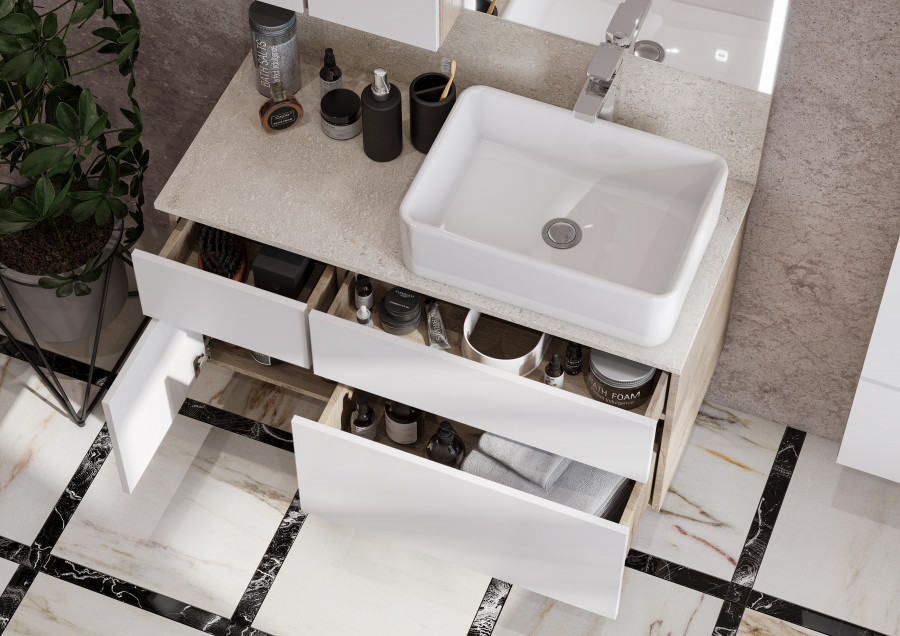 Тумба Мишель 100 очень функциональна: слева располагается небольшой выдвижной ящик, идеально подходящий для хранения мелочей, под которым находится отделение со створкой, а справа у тумбы расположены два вместительных ящика полного выдвижения, снабженных доводчиками. Все ящики и створка открываются с помощью системы push-to-open. На выбор возможно приобрести тумбу с традиционной столешницей из ВЛДСП или из керамогранита.