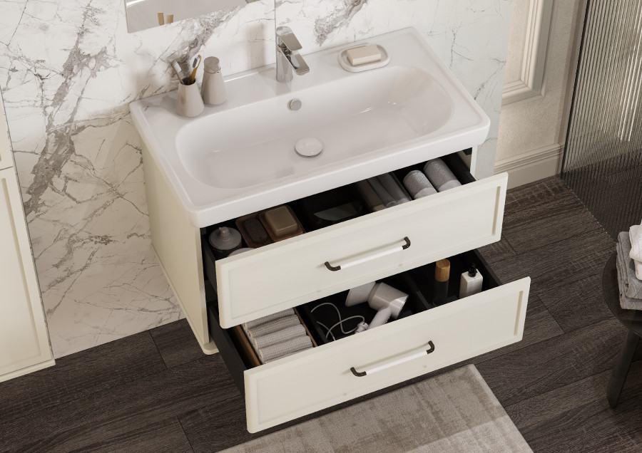 Коллекция мебели Нео-классика представляет собой гармоничное сочетание традиционных элементов и современных тенденций, создавая неповторимый стиль вашей ванной комнаты. Тумба изготовлена из высококачественной МДФ, покрытой матовой плёнкой. Фасады с фрезеровкой в рамочной форме гармонично сочетаются с остальными предметами этой коллекции. В тумбе есть два вместительных ящика с эргономичной организацией пространства, которую можно настроить по своему удобству. Ящики открываются при помощи удобной ручки, а благодаря направляющим с доводчиками обеспечивается плавное закрытие, что гарантирует бесшумность и комфорт использования мебели. Реальный цвет изделий может отличаться от представленных изображений. Производитель оставляет за собой право в любой момент, без обязательного извещения, вносить изменения в комплектацию, дизайн и характеристики , не ухудшающие качество товара.