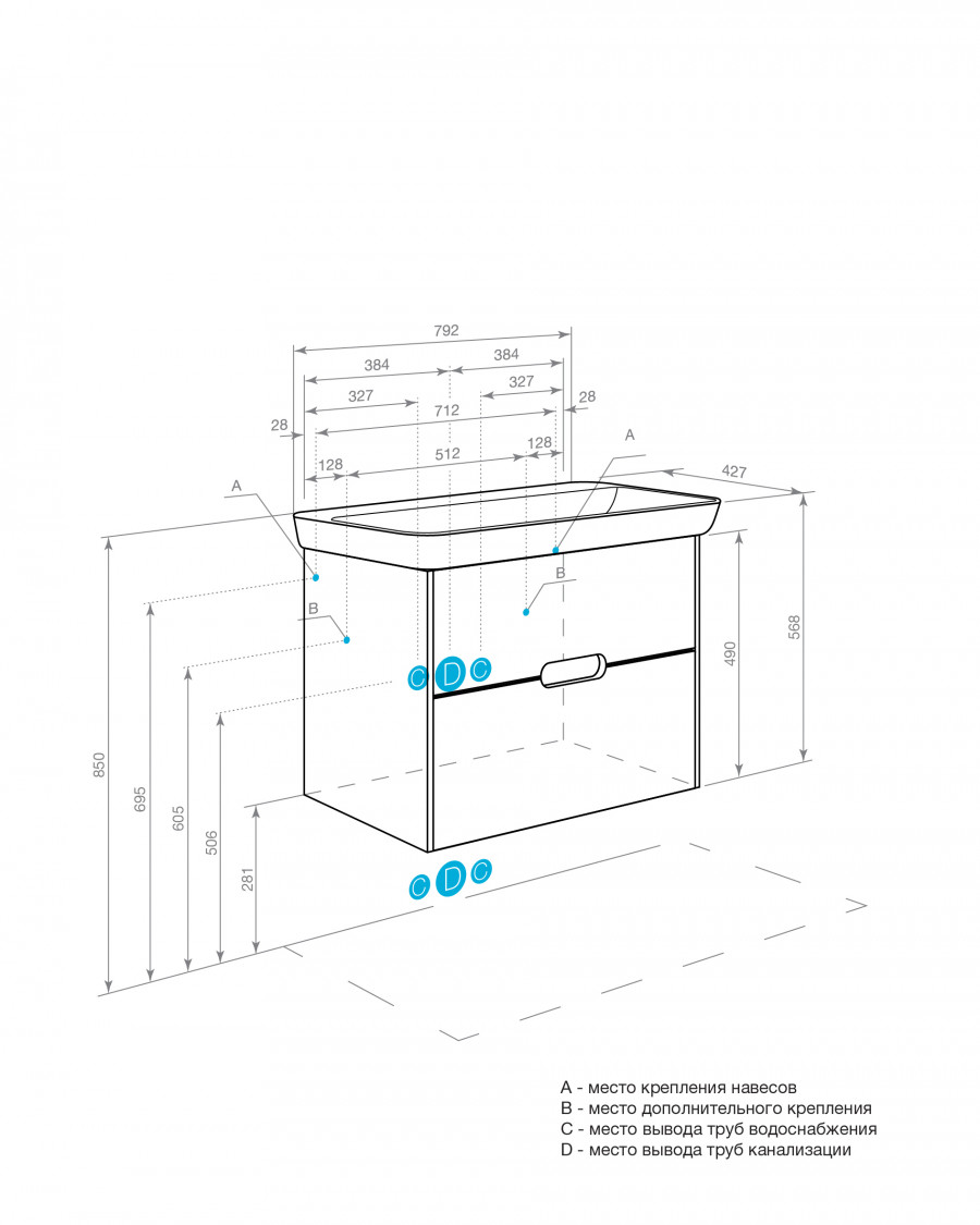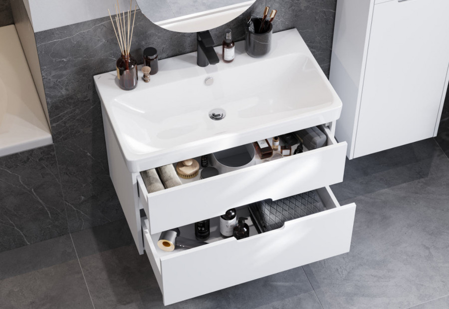 Корпус тумбы Оливия изготовлен из влагостойкой ламинированной ДСП в белой матовой покраске, а фасады ящиков в пленке от европейского производителя надежно защитят мебель от воздействия влаги в условиях ванной комнаты. Ящики установлены на направляющие полного выдвижения с доводчиками, что обеспечит легкий доступ ко всем предметам, которые хранятся в ящиках. Корпус и внутренние детали ящиков выполнены в единой цветовой гамме. Необычный вырез на фасадах создает имитацию ручки: оригинальный дизайн тумбы без выступающих деталей и комфортное использование. Размер ручки 18 см. К тумбе подойдет удобная современная керамическая раковина Адриана от бренда Santek.