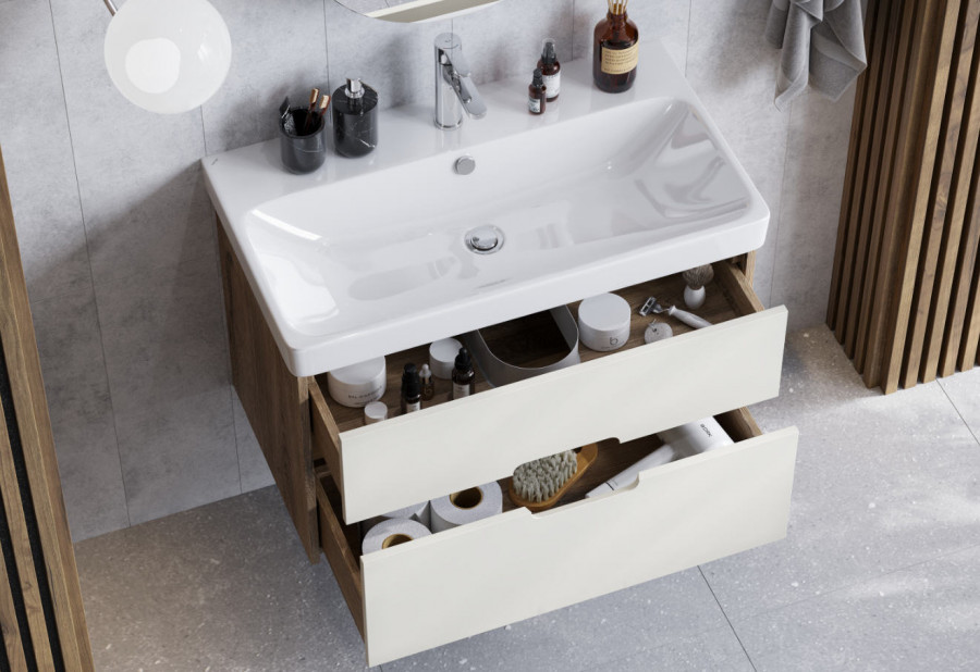 Корпус тумбы Оливия изготовлен из влагостойкой ламинированной ДСП с текстурой натурального дерева, а фасады ящиков в пленке от европейского производителя надежно защитят мебель от воздействия влаги в условиях ванной комнаты. Ящики установлены на направляющие полного выдвижения с доводчиками, что обеспечит легкий доступ ко всем предметам, которые хранятся в ящиках. Корпус и внутренние детали ящиков выполнены в единой цветовой гамме. Необычный вырез на фасадах создает имитацию ручки: оригинальный дизайн тумбы без выступающих деталей и комфортное использование. Размер ручки 18 см. К тумбе подойдет удобная современная керамическая раковина Адриана от бренда Santek.
