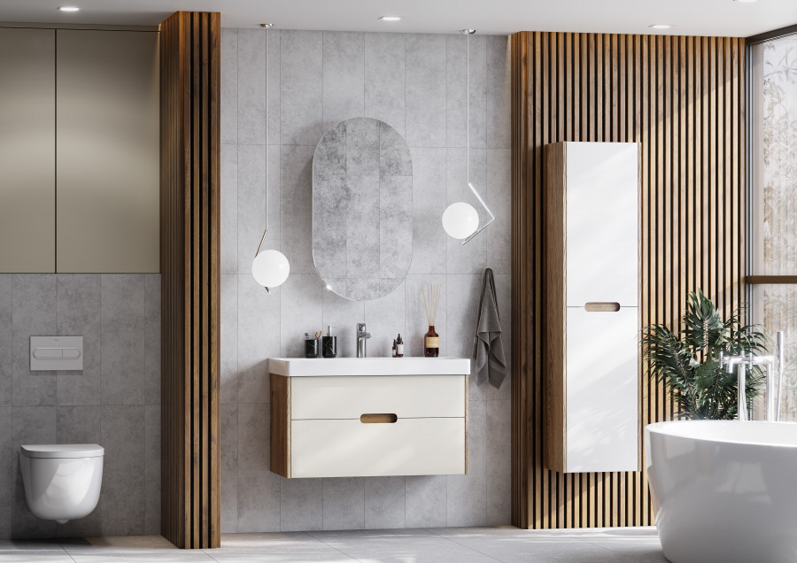 Корпус тумбы Оливия изготовлен из влагостойкой ламинированной ДСП с текстурой натурального дерева, а фасады ящиков в пленке от европейского производителя надежно защитят мебель от воздействия влаги в условиях ванной комнаты. Ящики установлены на направляющие полного выдвижения с доводчиками, что обеспечит легкий доступ ко всем предметам, которые хранятся в ящиках. Корпус и внутренние детали ящиков выполнены в единой цветовой гамме. Необычный вырез на фасадах создает имитацию ручки: оригинальный дизайн тумбы без выступающих деталей и комфортное использование. Размер ручки 18 см. К тумбе подойдет удобная современная керамическая раковина Адриана от бренда Santek.