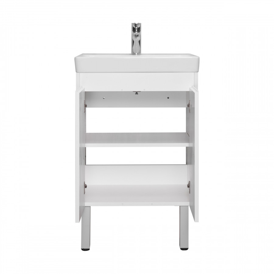 Тумба Сканди Doors 55 выполнена в популярном минималистичном скандинавском стиле. Корпус тумбы выполнен из влагостойкой ЛДСП в белой матовой покраске, а фасады-створки в белой глянцевой покраске. За створками скрывается вместительное пространство, разделенное на две части регулируемой по высоте полкой из ВЛДСП. На тумбе нет выступающих деталей и фурнитуры, открытие створок реализуется за фасад, верхняя часть которого обработана под ручку J-профиль. К тумбе идеально подходит белоснежная раковина Адриана от бренда Santek. Раковина продается отдельно.