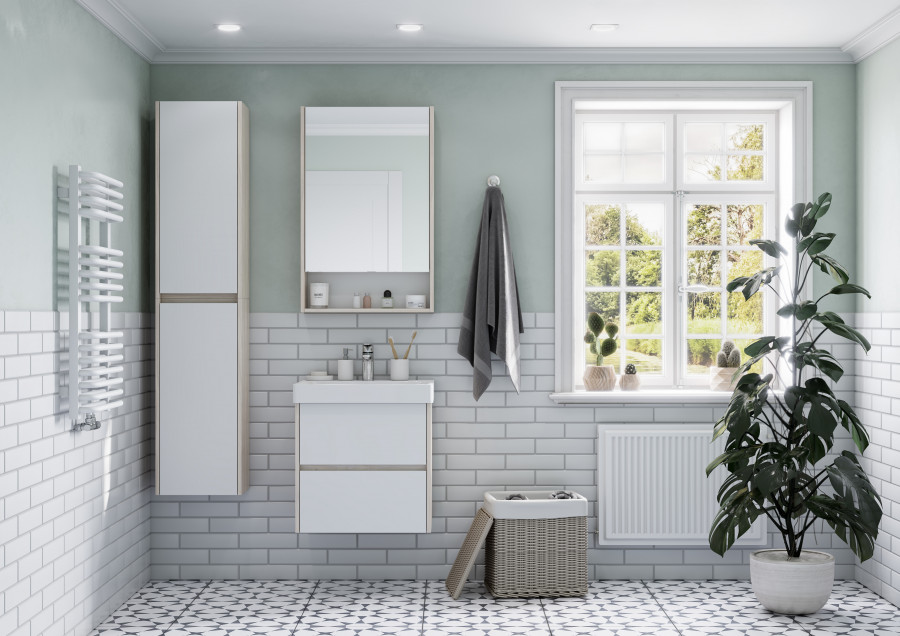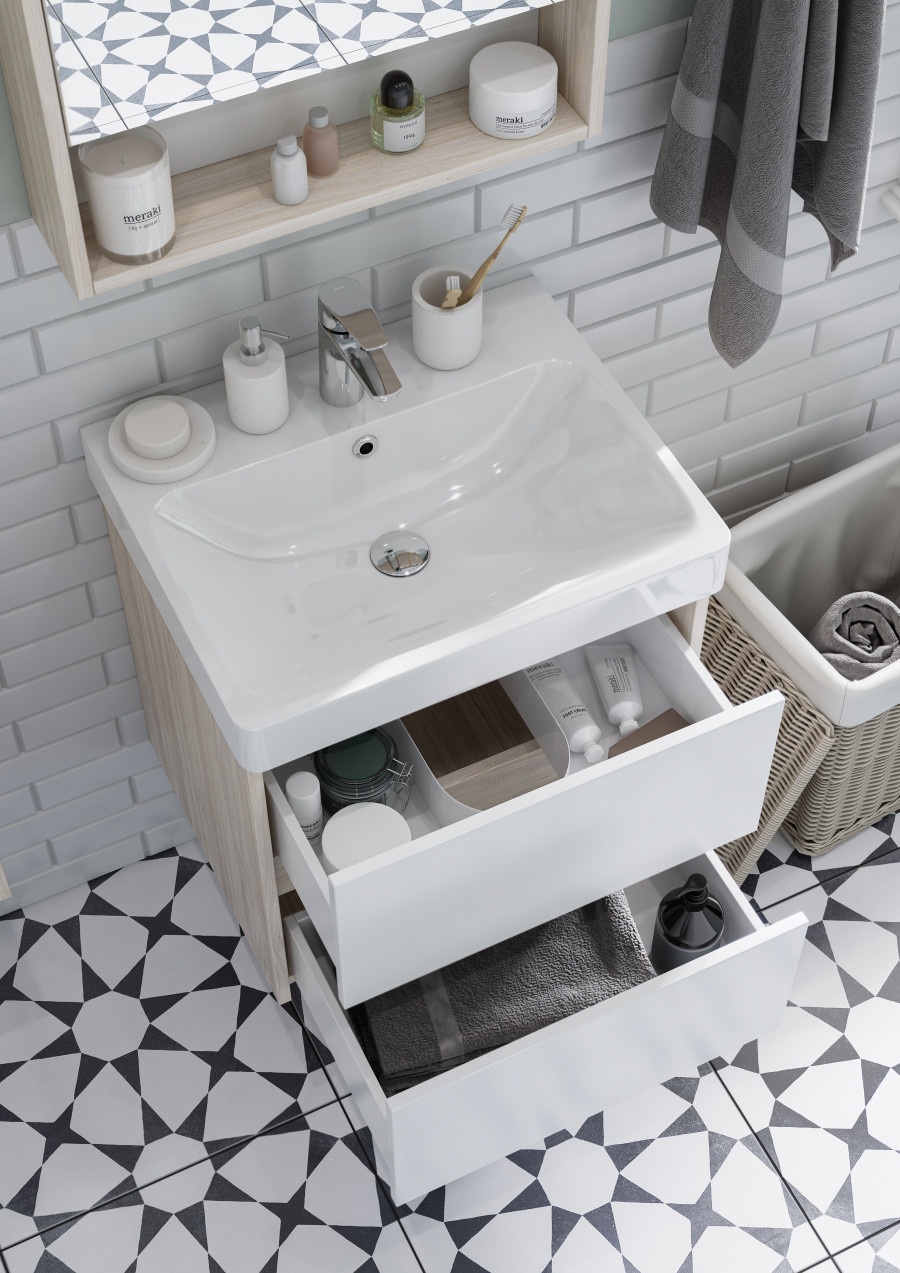 Тумба Сканди 55 выполнена в популярном минималистичном скандинавском стиле. Корпус тумбы выполнен из влагостойкой ЛДСП в декоре натурального дерева, а фасады в белой глянцевой покраске. Конструктивно тумба состоит из 2 вместительных ящиков, установленных на направляющие с интегрированной системой push-to-open для комфортного использования. На тумбе нет выступающих деталей и фурнитуры, открытие ящиков реализовано нажатием на фасад. К тумбе идеально подходит белоснежная раковина Адриана от бренда Santek. Раковина продается отдельно.