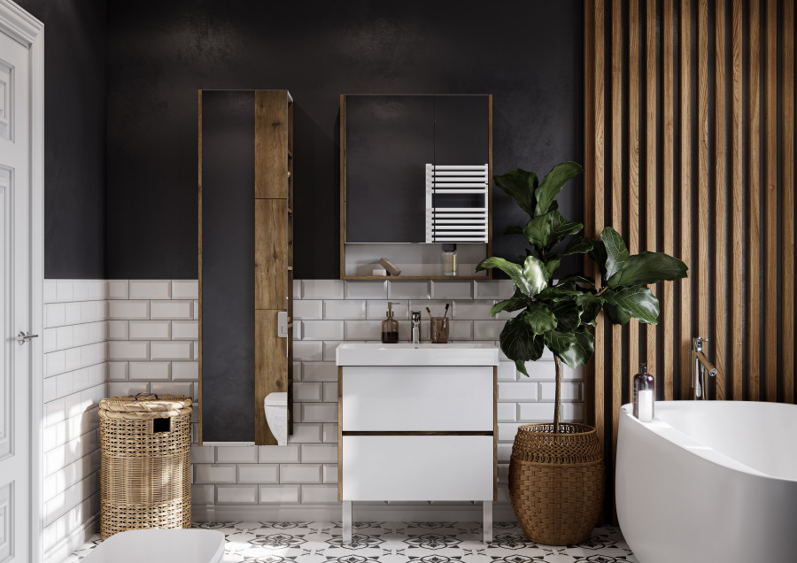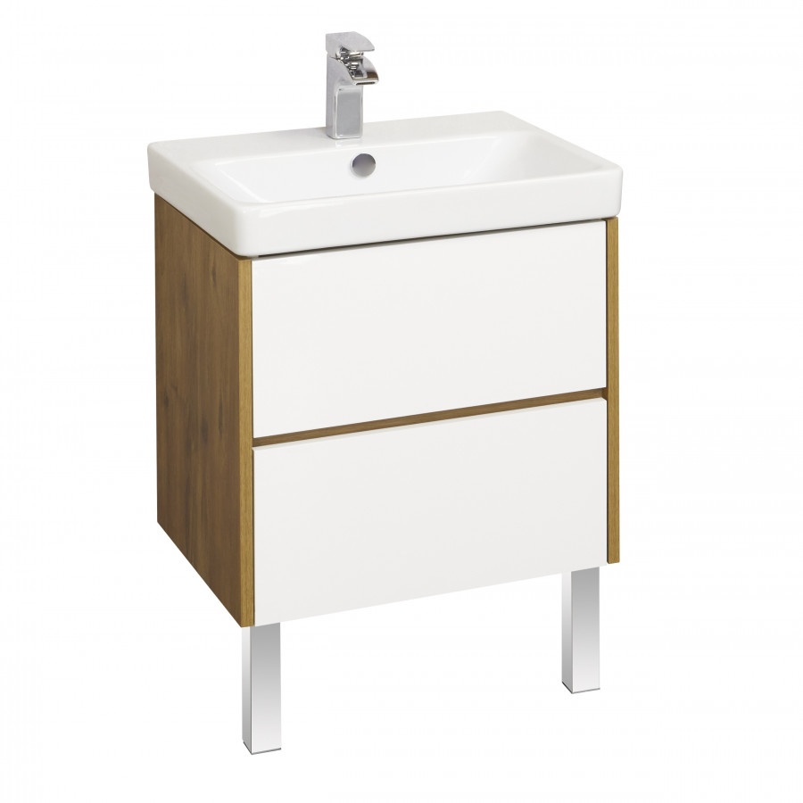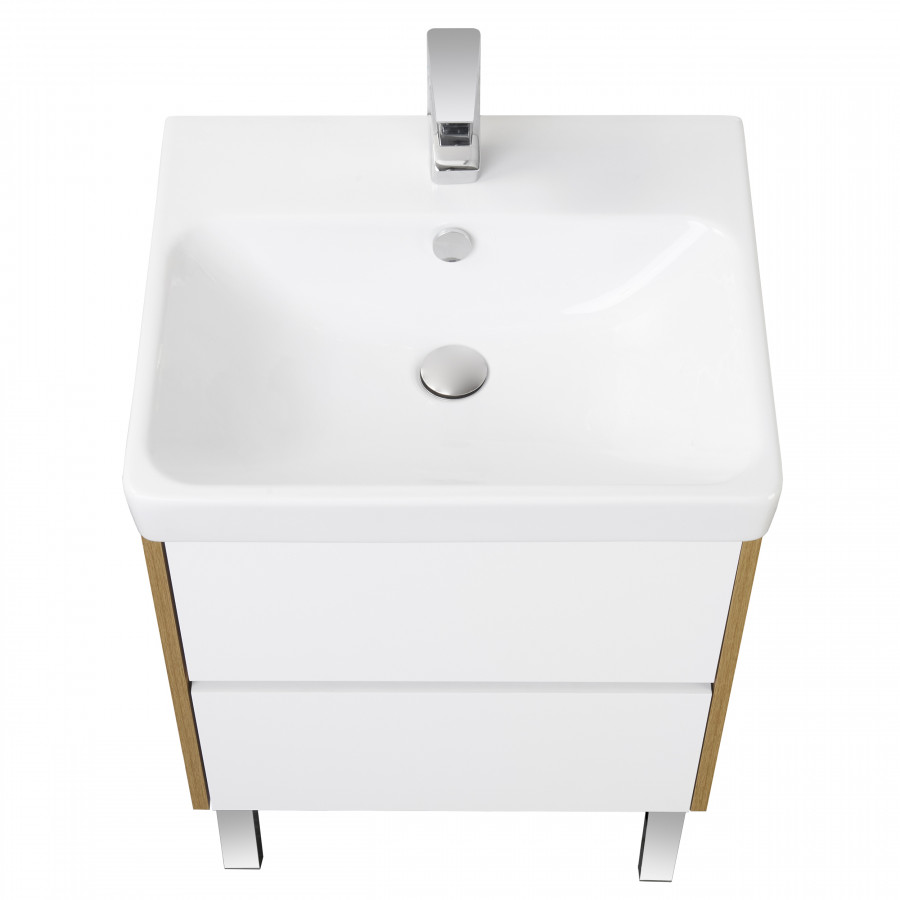 Тумба Сканди 70 выполнена в популярном минималистичном скандинавском стиле. Корпус тумбы выполнен из влагостойкой ЛДСП в декоре натурального дерева, а фасады в белой глянцевой покраске. Конструктивно тумба состоит из 2 вместительных ящиков, установленных на направляющие с интегрированной системой push-to-open для комфортного использования. На тумбе нет выступающих деталей и фурнитуры, открытие ящиков реализовано нажатием на фасад. К тумбе идеально подходит белоснежная раковина Адриана от бренда Santek. Раковина продается отдельно. Тумбу по желанию можно использовать в двух вариантах: как подвесную или дополнительно приобрести опоры