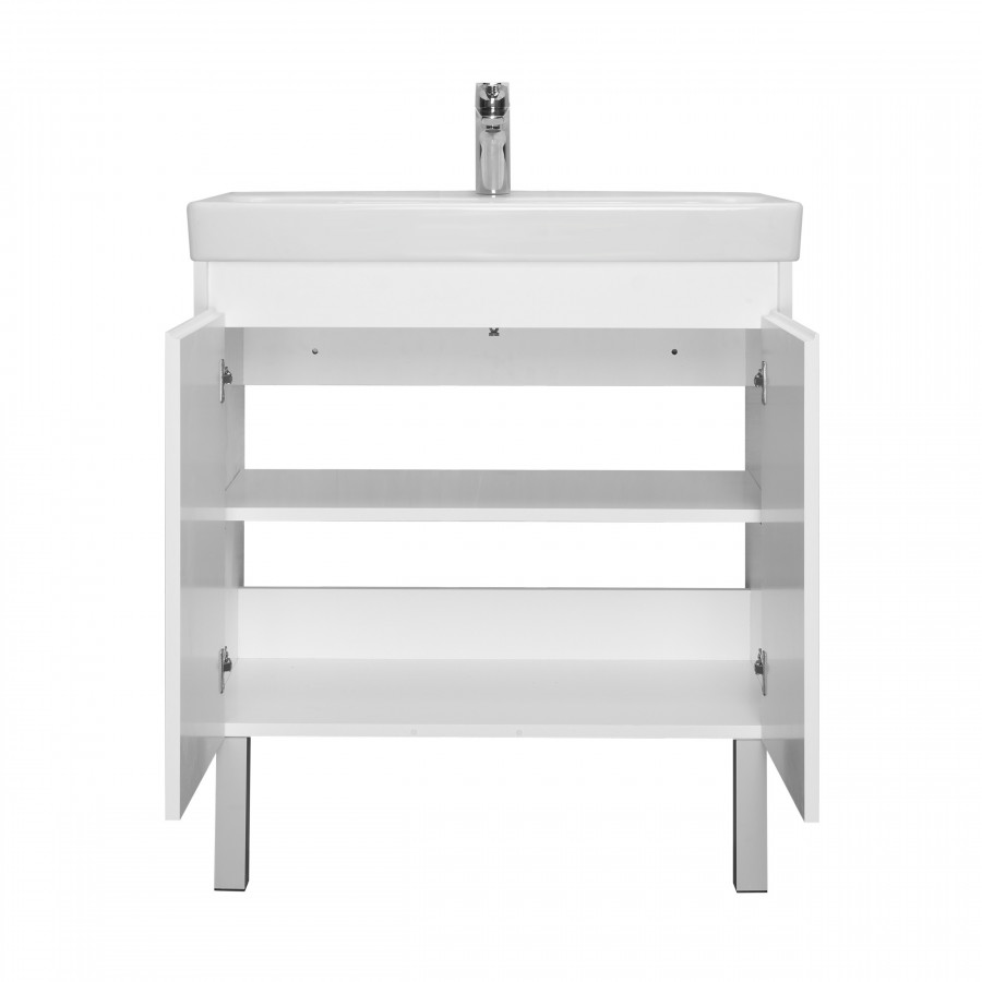 Тумба Сканди Doors 80 выполнена в популярном минималистичном скандинавском стиле. Корпус тумбы выполнен из влагостойкой ЛДСП в белой матовой покраске, а фасады-створки в белой глянцевой покраске. За створками скрывается вместительное пространство, разделенное на две части регулируемой по высоте полкой из ВЛДСП. На тумбе нет выступающих деталей и фурнитуры, открытие створок реализуется за фасад, верхняя часть которого обработана под ручку L-профиль. К тумбе идеально подходит белоснежная раковина Адриана от бренда Santek. Раковина продается отдельно.