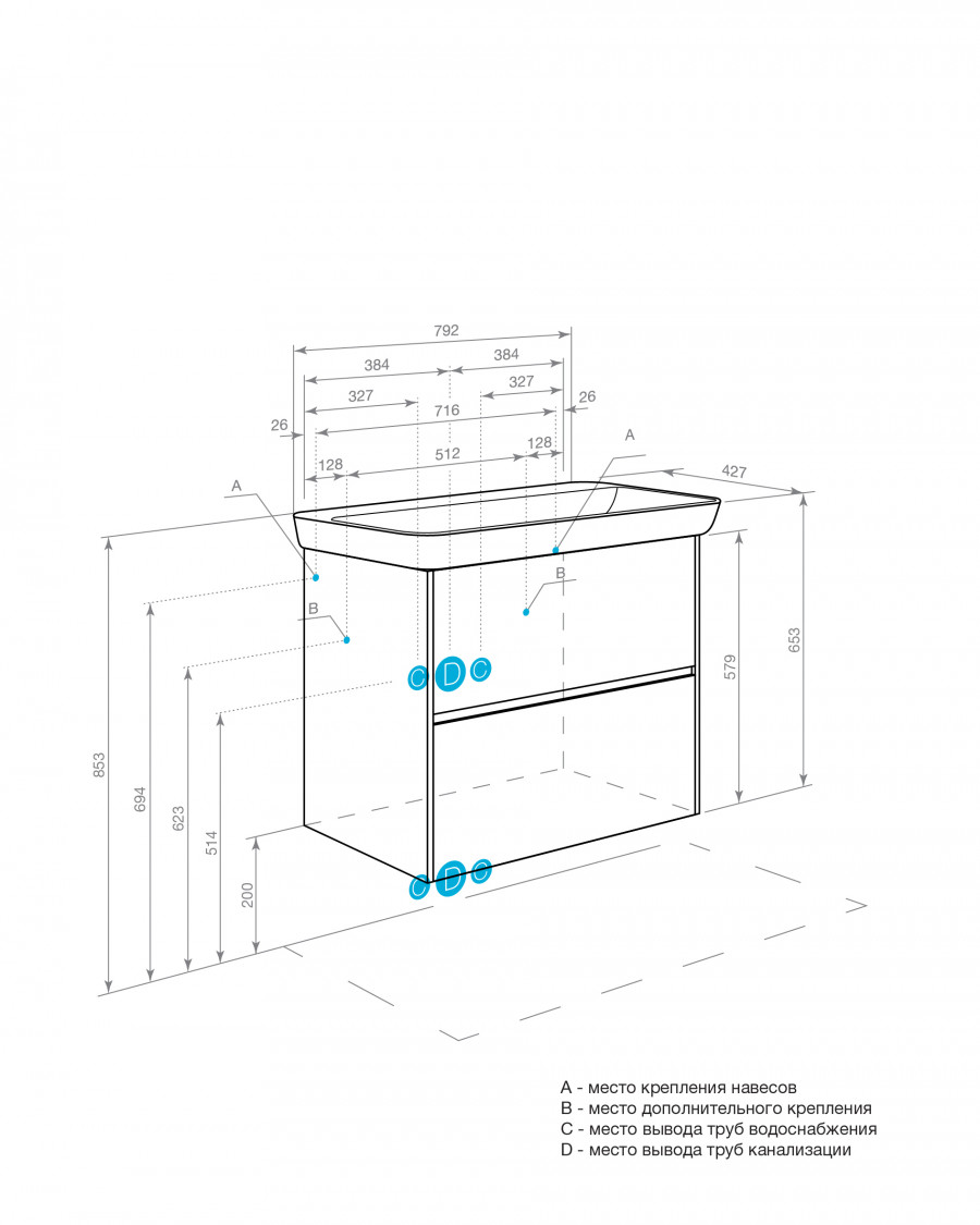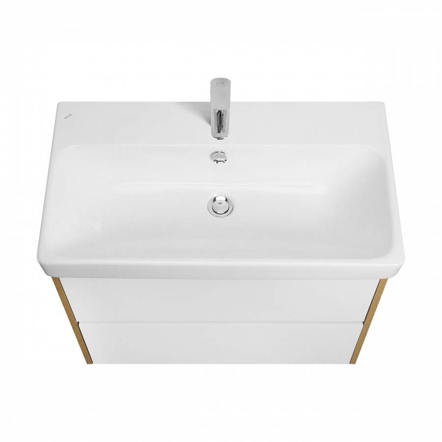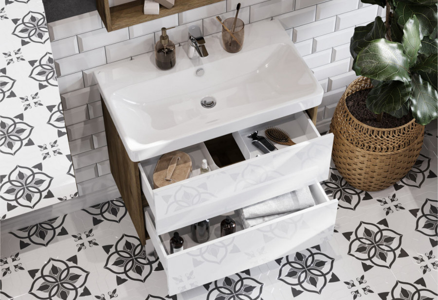 Тумба Сканди 80 выполнена в популярном минималистичном скандинавском стиле. Корпус тумбы выполнен из влагостойкой ЛДСП в декоре натурального дерева, а фасады в белой глянцевой покраске. Конструктивно тумба состоит из 2 вместительных ящиков, установленных на направляющие с интегрированной системой push-to-open для комфортного использования. На тумбе нет выступающих деталей и фурнитуры, открытие ящиков реализовано нажатием на фасад. Тумба комплектуется белоснежной раковиной Адриана от бренда Santek. Тумбу по желанию можно использовать в двух вариантах: как подвесную или дополнительно приобрести опоры