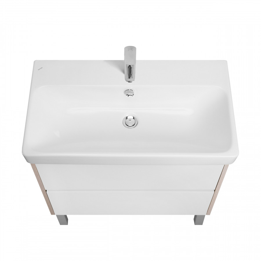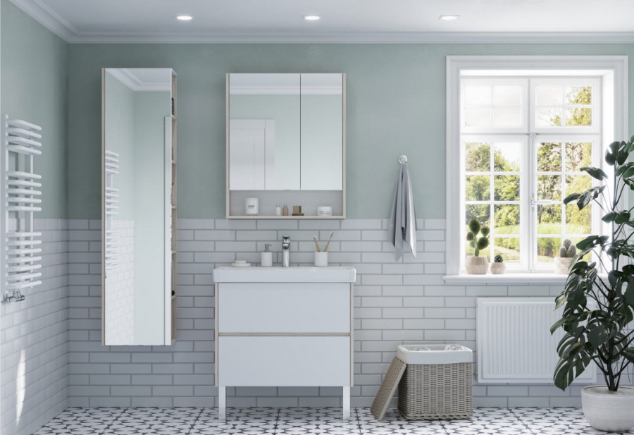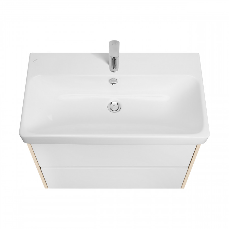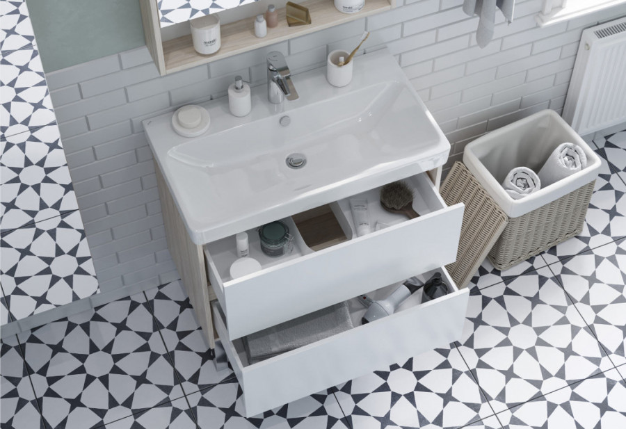 Тумба Сканди 80 выполнена в популярном минималистичном скандинавском стиле. Корпус тумбы выполнен из влагостойкой ЛДСП в декоре натурального дерева, а фасады в белой глянцевой покраске. Конструктивно тумба состоит из 2 вместительных ящиков, установленных на направляющие с интегрированной системой push-to-open для комфортного использования. На тумбе нет выступающих деталей и фурнитуры, открытие ящиков реализовано нажатием на фасад. Тумба комплектуется белоснежной раковиной Адриана от бренда Santek. Тумбу по желанию можно использовать в двух вариантах: как подвесную или дополнительно приобрести опоры