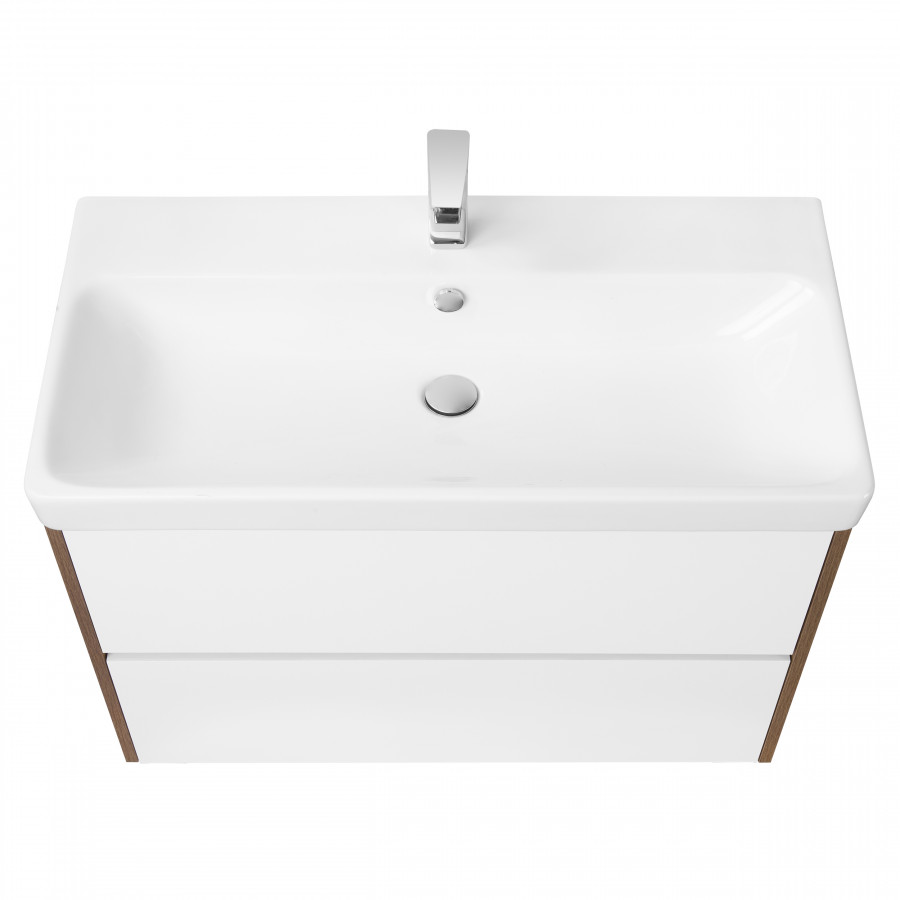 Тумба Сканди 90 выполнена в популярном минималистичном скандинавском стиле. Корпус тумбы выполнен из влагостойкой ЛДСП в декоре натурального дерева, а фасады в белой глянцевой покраске. Конструктивно тумба состоит из 2 вместительных ящиков, установленных на направляющие с интегрированной системой push-to-open для комфортного использования. На тумбе нет выступающих деталей и фурнитуры, открытие ящиков реализовано нажатием на фасад. К тумбе идеально подходит белоснежная раковина Адриана от бренда Santek. Раковина продается отдельно. Тумбу по желанию можно использовать в двух вариантах: как подвесную или дополнительно приобрести опоры