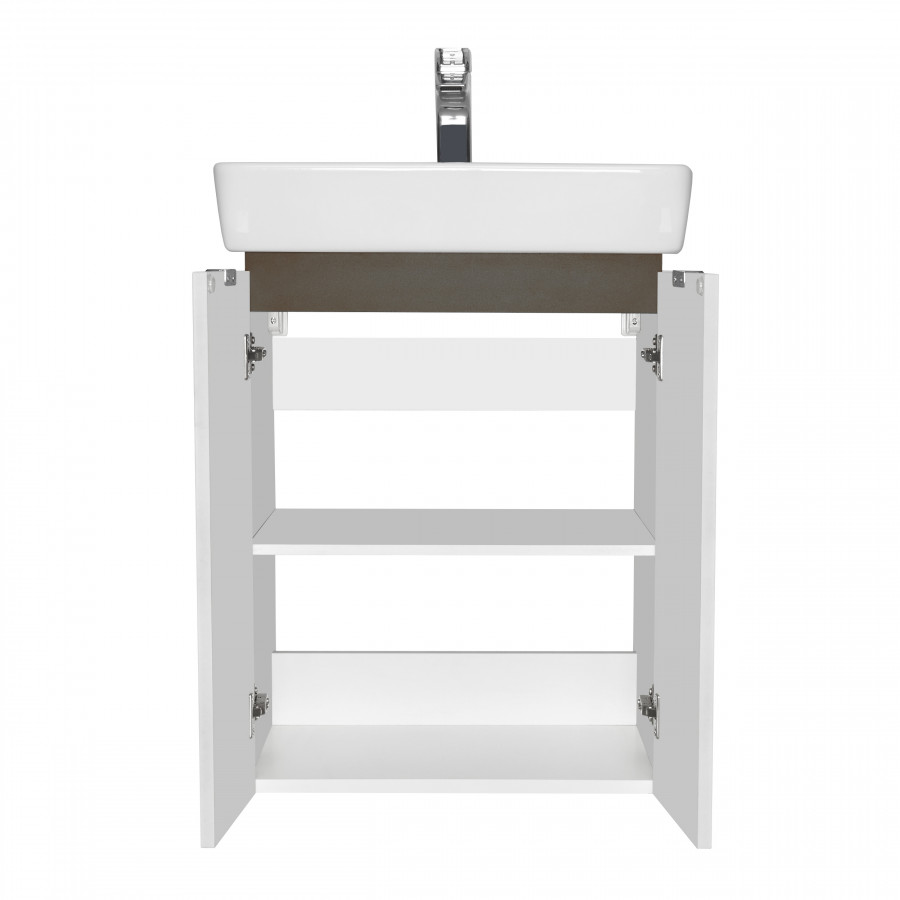 Вместительная и при этом компактная тумба Скай PRO 55 от AQUATON в современном стиле гармонично сочетает ультрабелые глянцевые фасады с декоративной вставкой в цвете серый кашемир - элегантное и практичное решение для удобной организации пространства в небольших ванных комнатах. Корпус модели из влагостойкой ЛДСП и фасады из высококачественной МДФ покрыты белой полиэфирной краской ультрафиолетового отверждения, которая гарантирует безупречный внешний вид, а также прочность и долговечность. За распашными фасадами-створками находится регулируемая по высоте полка, таким образом внутри достаточно места, чтобы разместить всё необходимое. Петли с доводчиком обеспечивают плавное и бесшумное закрывание. Белоснежные глянцевые фасады подчеркивают эргономичные хромированные ручки. Идеальный комплект с тумбой составит раковина Нео от бренда Santek.