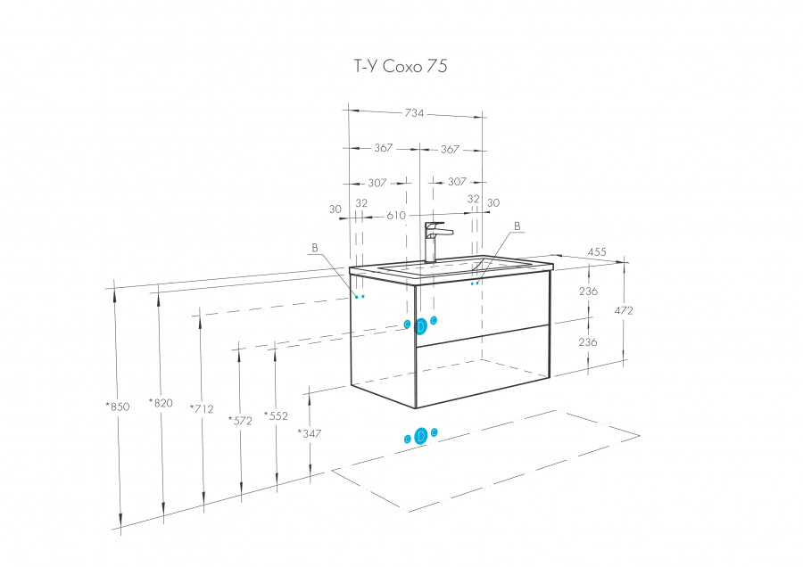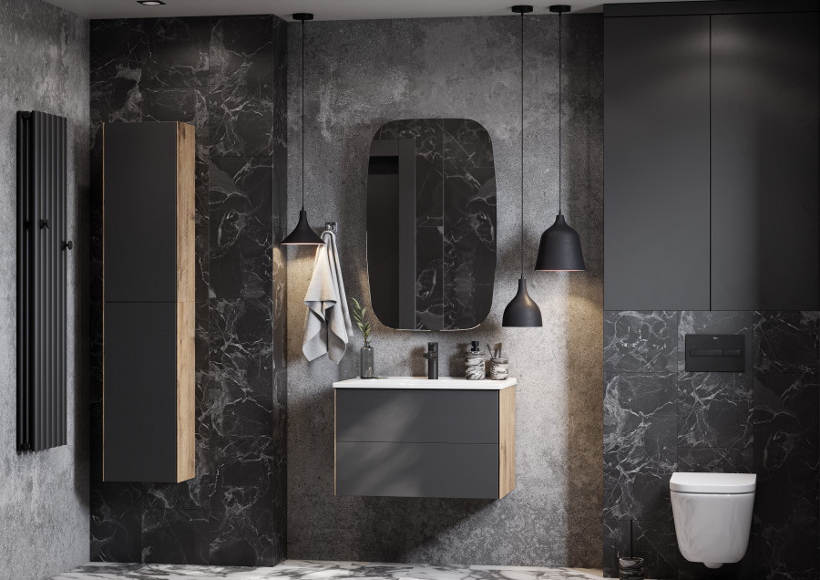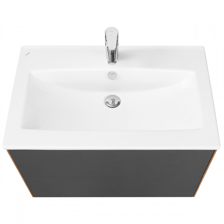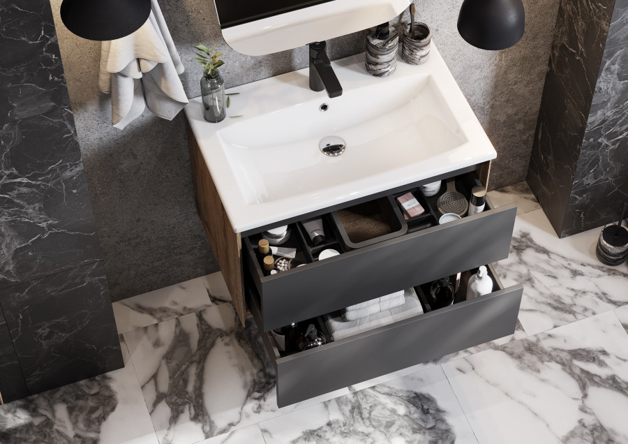 Тумба Сохо 75 функционально состоит из двух вместительных ящиков, оснащенных системой push to open, обеспечивающей надежное, комфортное и бесшумное закрывание. Фасады изделия выполнены из МДФ в пленке графит с эффектом soft touch, корпус из ламинированной влагостойкой ДСП Дуб веллингтон. Верхний и нижний ящики оснащены системой организации пространства, которая позволяет содержать косметические средства в идеальном порядке. Дополняет тумбу стильная раковина Элина от бренда Santek с удобной чашей. Все внутренние детали тумбы выполнены в тон фасадов - цвета антрацит.