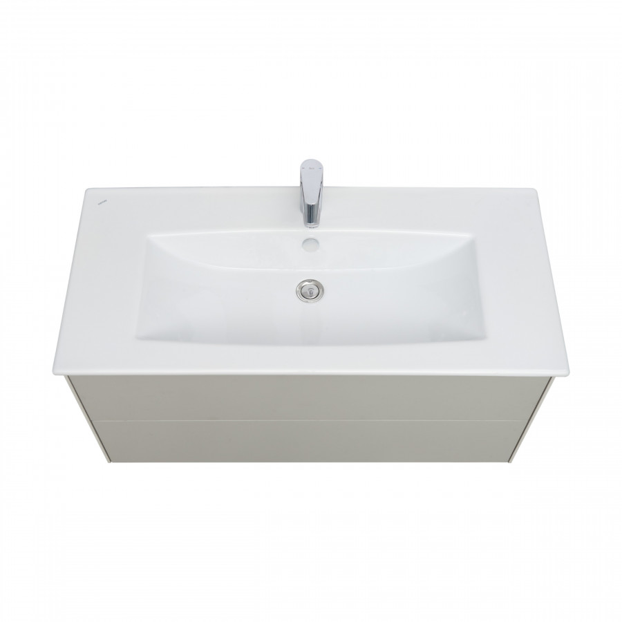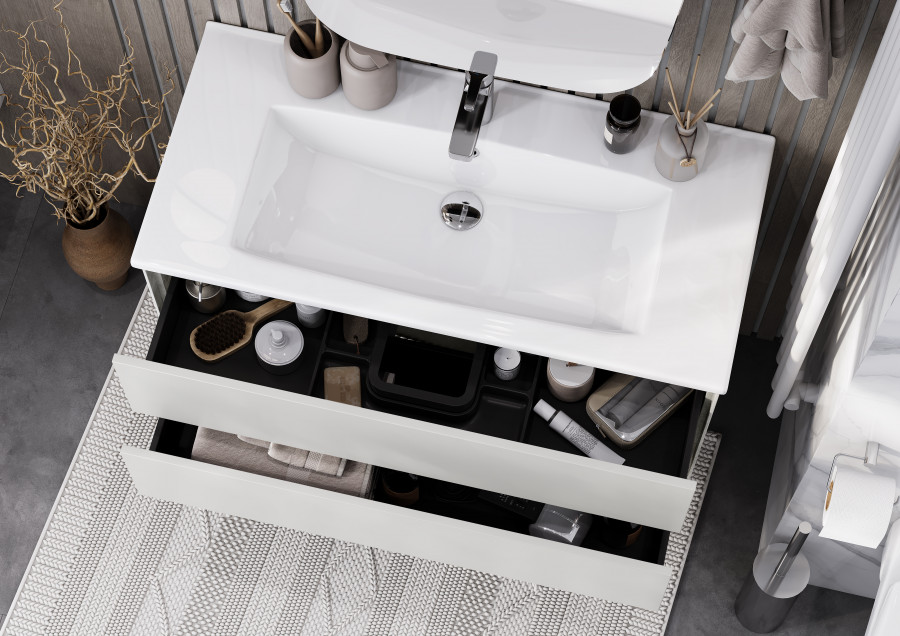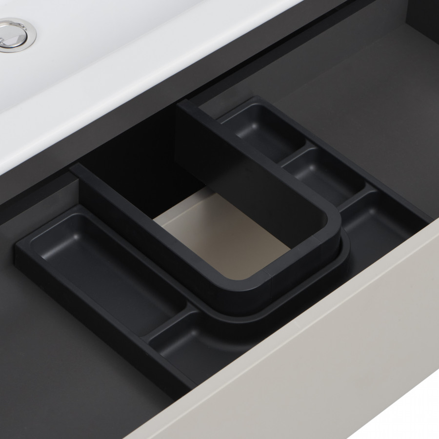 Тумба Сохо 100 функционально состоит из двух вместительных ящиков, оснащенных системой push to open, обеспечивающей надежное, комфортное и бесшумное закрывание. Фасады изделия выполнены из МДФ в пленке в цвете галька серая, корпус из ламинированной влагостойкой ДСП слэйт. Верхний и нижний ящики оснащены системой организации пространства, которая позволяет содержать косметические средства в идеальном порядке. Дополняет тумбу стильная раковина Элина от бренда Santek с удобной чашей. Все внутренние детали тумбы выполнены в цвете антрацит.
