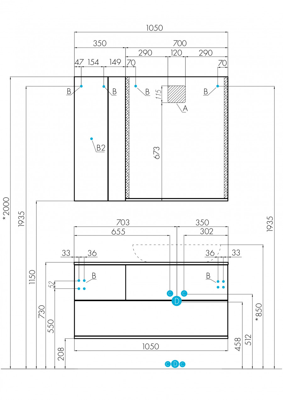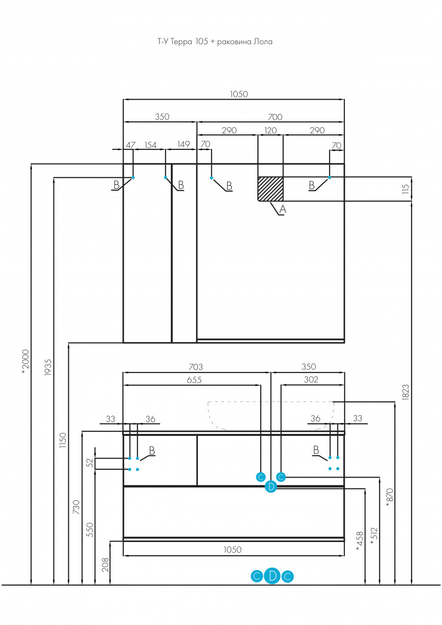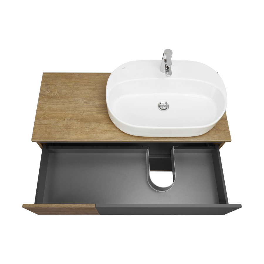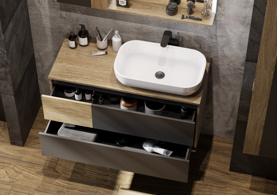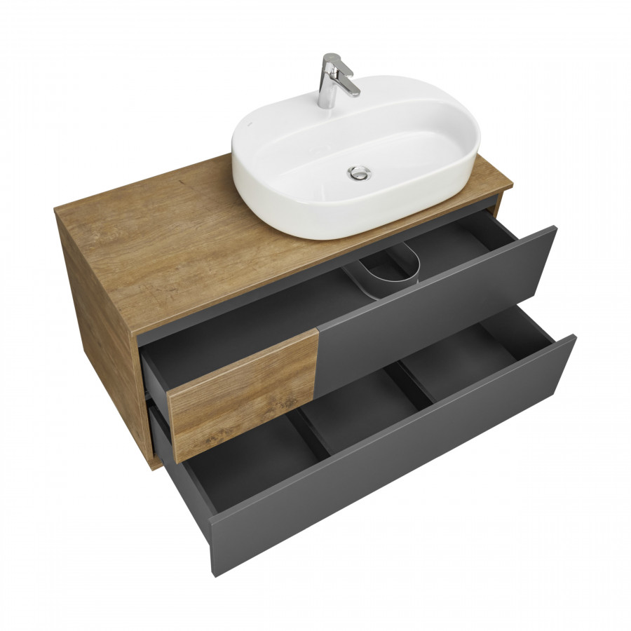 Коллекция Терра сочетает стильные оттенки: дуб кантри и антрацит. Текстуры на тумбе Терра 105 расположены ассиметрично: столешница, корпус и вставка на верхнем ящике - влагостойкое ДСП с текстурой дуб кантри, фасады ящиков - матовая серая пленка антрацит. Тумба умывальник состоит из двух вместительных ящиков, открывающихся с помощью системы push-to-open, нижний ящик комплектуется системой организации пространства, которая препятствует смещению мелких косметических и гигиенических средств.