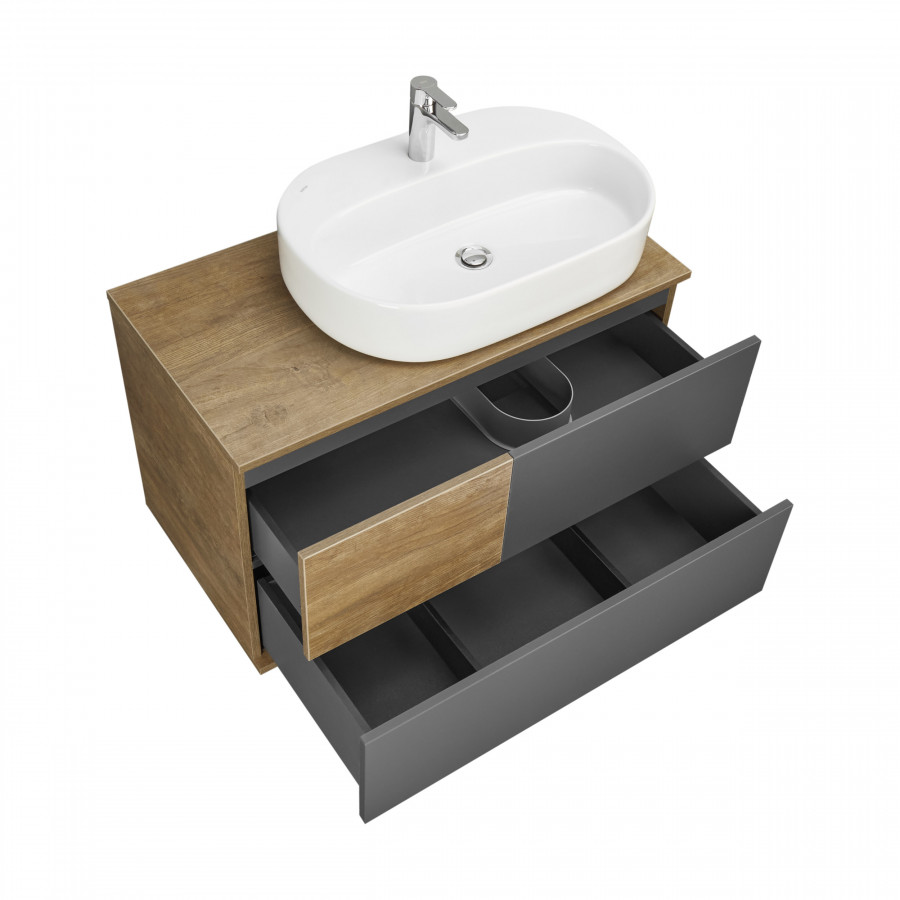Мебель коллекции Терра сочетает в себе стильные оттенки: дуб кантри и антрацит. Тумба Терра 85 состоит из двух вместительных ящиков, открывающихся с помощью системы push-to-open, нижний ящик комплектуется системой организации пространства, которая препятствует смещению мелких косметических и гигиенических средств. Фасады ящиков - матовая серая пленка антрацит, а столешница, корпус и вставка на верхнем ящике - влагостойкое ДСП с текстурой дуб кантри.