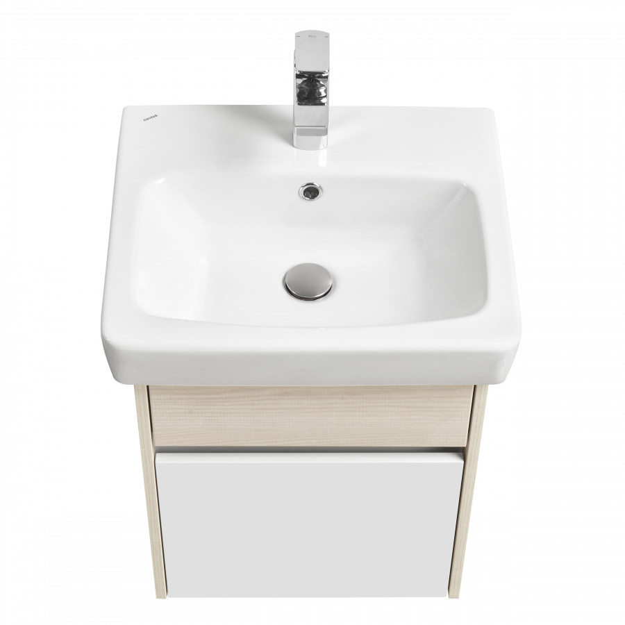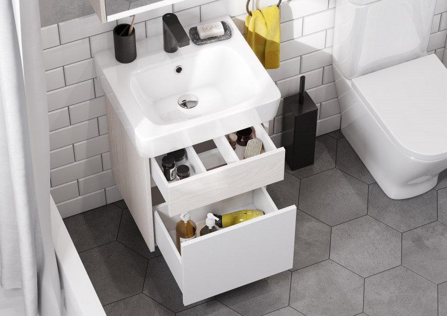 Подвесная тумба под раковину Верди PRO 50 от AQUATON - функциональное и практичное решение для ванных комнат и санузлов со скромными габаритами. Компактная модель с комбинированной отделкой не занимает много места и позволяет разместить всё необходимое. Минималистичный дизайн подчеркивает отсутствие лицевой фурнитуры. Верхний фасад и корпус тумбы изготовлены из ламинированной, текстурированной влагостойкой ЛДСП в цвете ясень фабрик. Нижний фасад выполнен из МДФ и окрашен в белый цвет высокой степени глянца. Конструкция верхнего ящика подвесных тумб разделена на две секции, что очень удобно для хранения мелких предметов. Глубокий и вместительный нижний ящик предназначен для более габаритных предметов.