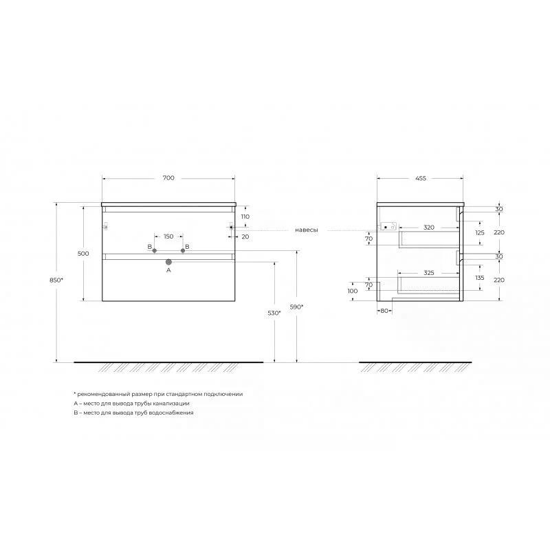Тумба подвесная Cezares Kraft 700x455x500 с фрезерованными ручками по всей длине фасада с двумя выкатными ящиками Темно-Серый матовый (KRAFT-700-2C-SO