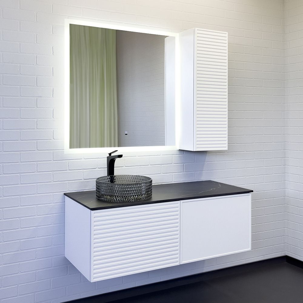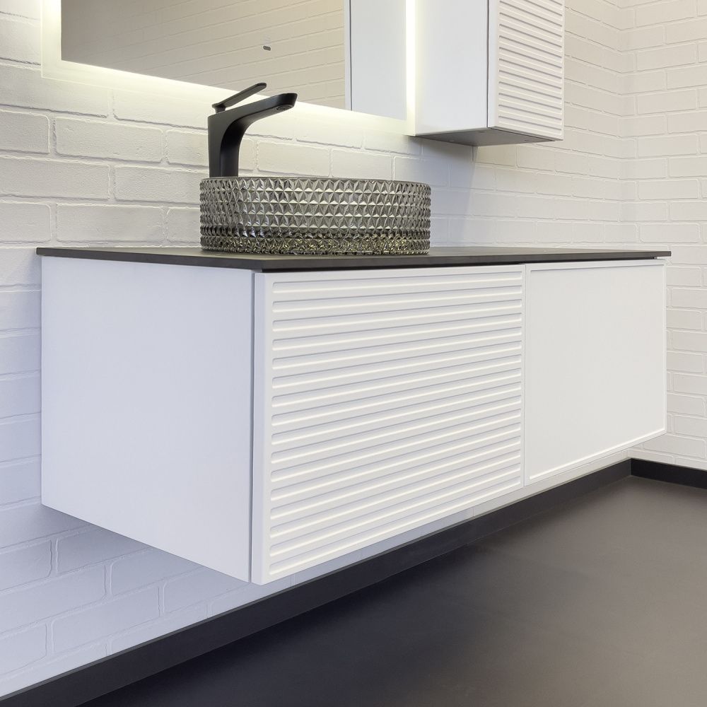 Подвесная тумба-умывальник с одним выкатным ящиком и створкой, система открывания при нажатии push-to-open. Фасад ящика декорирован горизонтальными профильными пазами. Створка и фасад окрашены белой матовой эмалью. Тумба подготовлена для подключения водоснабжения снизу и сзади.