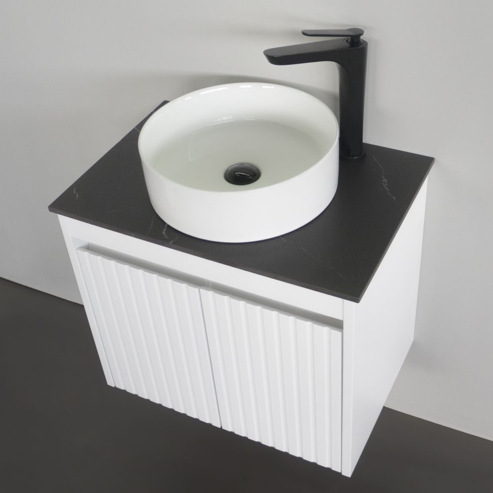 Комплектация: накладная керамическая раковина Comforty 9111, черная матовая столешница из керамогранита под мрамор Калакатта Блэк.