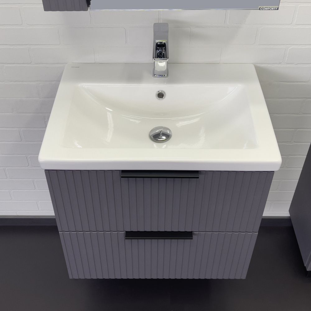 Подвесная тумба-умывальник шириной 60 см с двумя выдвижными ящиками. Фасады ящиков декорированы вертикальной фрезеровкой. Ящики оснащены направляющими с механизмами плавного закрывания. В модели применяется матовая плёнка цвета антрацит с эффектом Soft-Touch.