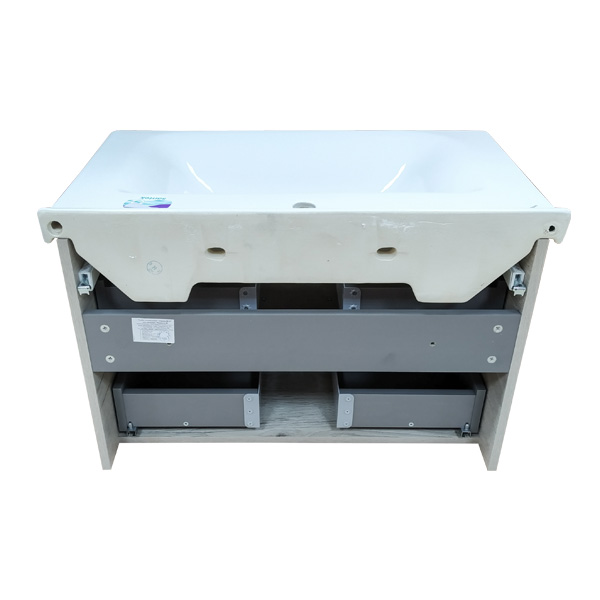 Подвесная тумба-умывальник с двумя выкатными ящиками. Ящики оснащены доводчиками для плавного закрывания.