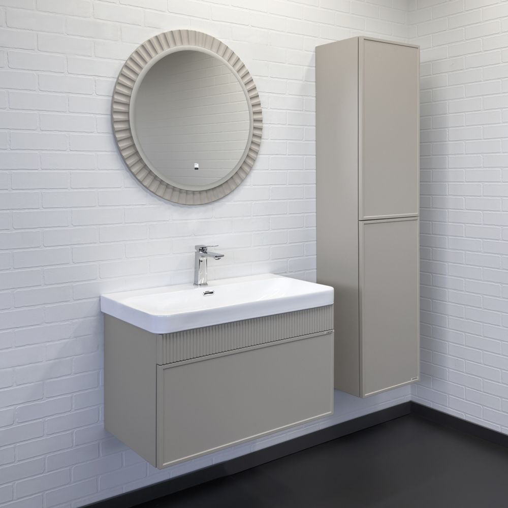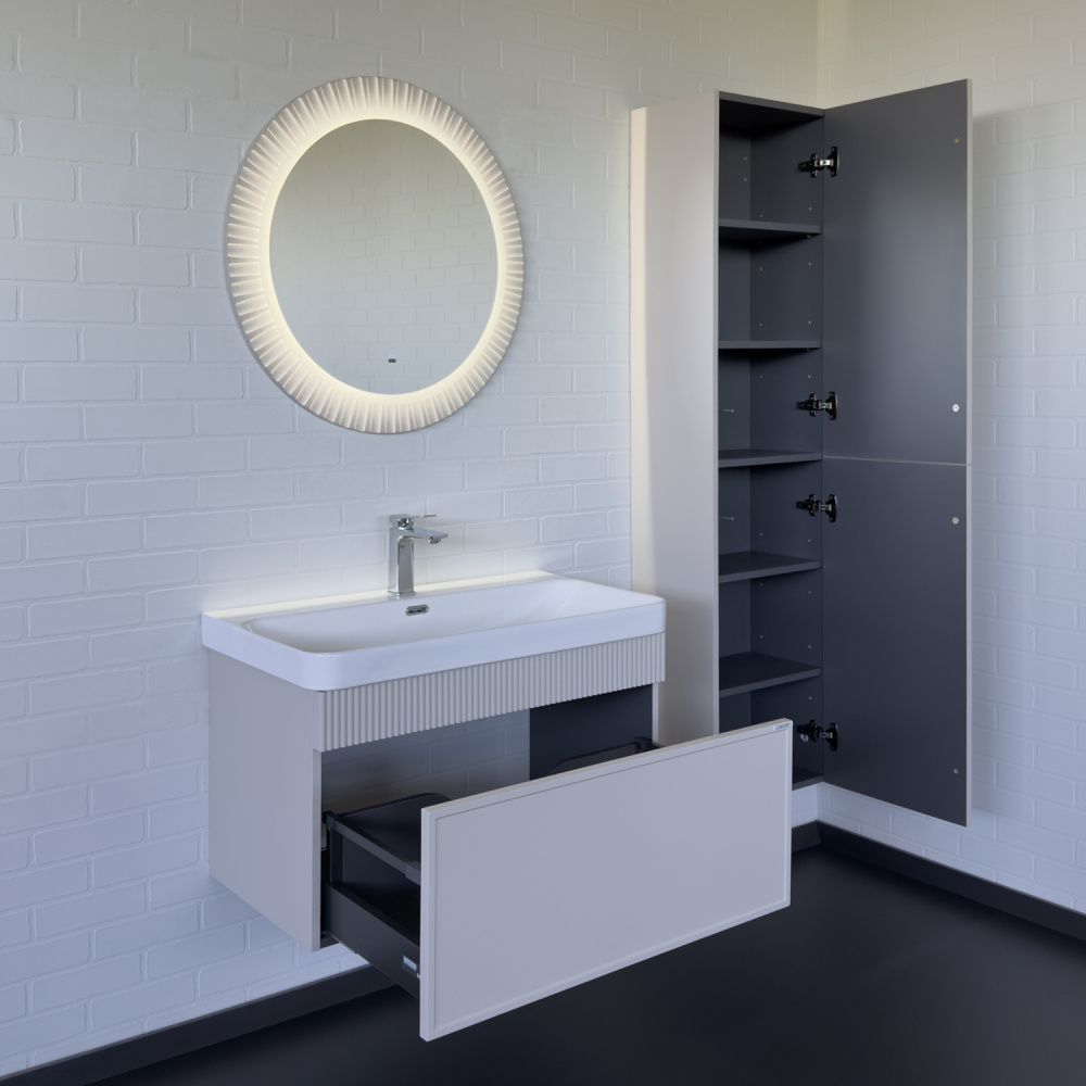 Подвесная тумба с одним большим выкатным ящиком оборудованным направляющими с системой плавного закрывания. Корпус тумбы изготовлены из влагостойкого ЛДСП. Фасад тумбы из МДФ фрезерован кантом по периметру. Подпорная царга фрезерована вертикальным узором. Корпус и фасад тумбы затянуты в матовую пленку цвета ""серый шёлк"". Тумба подготовлена для подключения водоснабжения снизу и сзади.
