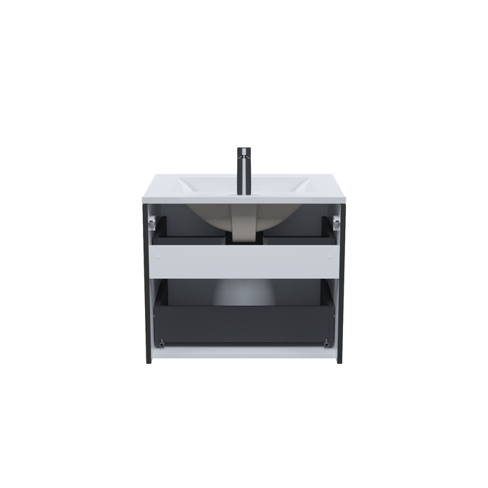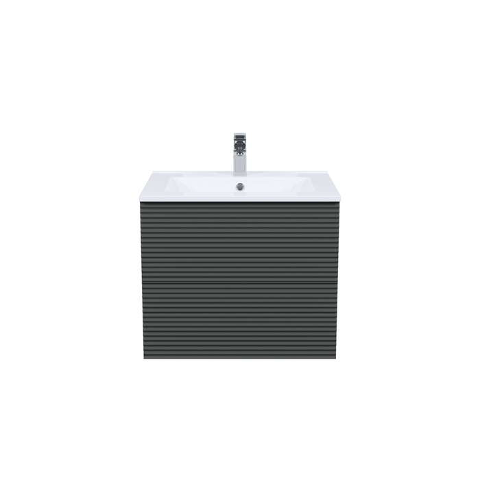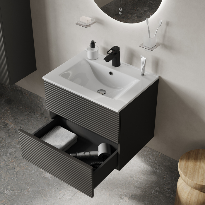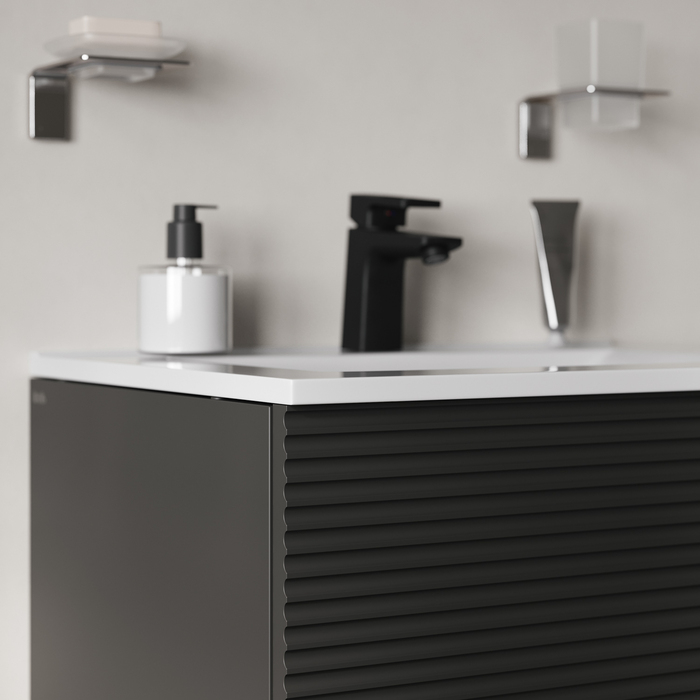 Тумба для ванной комнаты, подвесная, Bild. Размеры: 452*799*500 (Д*Ш*В). Система установки: навесная. Материал фасада: МДФ 19 мм. Материал боковин: МДФ 16 мм. Покрытие фасада и боковин: пленка ПВХ. Цвет покрытия: темно-серый. Фурнитура: Hettich. Система открывания: Push-to-Open. Пластиковая защита сифона в верхнем ящике. Подходит умывальник: 0138000i28. Фрезеровка «полосы» горизонтальная.
