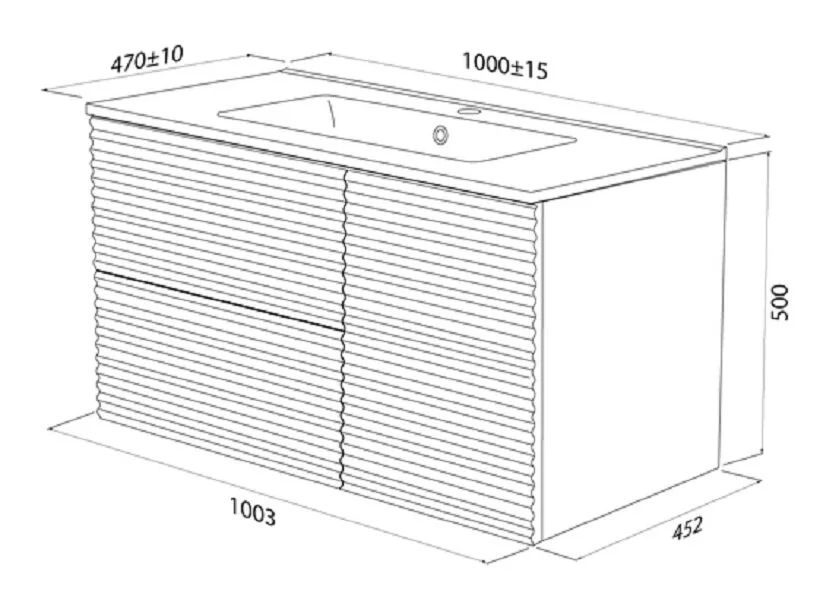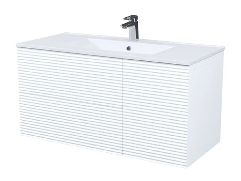 Тумба для ванной комнаты с умывальником, подвесная, Bild. Размер комплекта: 452*1003*500 (Д*Ш*В). Система установки: навесная. Материал фасада: МДФ. Материал боковин: МДФ. Покрытие фасада и боковин: пленка ПВХ. Цвет покрытия: белый матовый. Фурнитура: Hettich, IDDIS. Система открывания: Push-to-Open. Пластиковая защита сифона в верхнем ящике. Фрезеровка «полосы» горизонтальная. Умывальник: 0131000i28. Материал умывальника: Санфарфор.