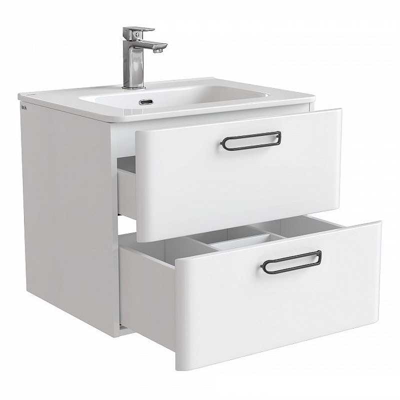 Тумба с двумя выдвижными ящиками с направляющими скрытого монтажа и механизмом плавного доведения. Предназначена для использования в ванных комнатах с повышенной влажностью. Плоская керамическая раковина повторяет закругленную форму тумбы.