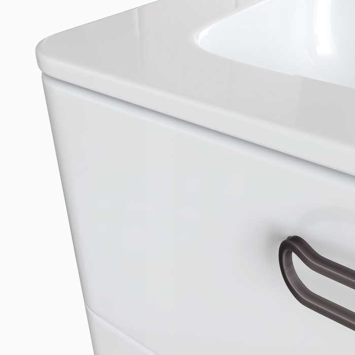 Подвесная тумба с раковиной Iddis Brick 60 BRI60W0i95K с двумя выдвижными ящиками с направляющими скрытого монтажа и механизмом плавного доведения. Предназначена для использования в ванных комнатах с повышенной влажностью. Плоская керамическая раковина повторяет закругленную форму тумбы. Надежная фурнитура рассчитана на 30 тысяч открываний. Направляющие выдерживают вес доверху наполненного ящика.