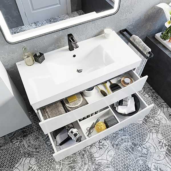 Подвесная тумба с раковиной Iddis Cloud 100 CLO10W1i95K с двумя выдвижными ящиками. Предназначена для использования в ванных комнатах с повышенной влажностью. Влагостойкие материалы повышенной плотности. Высококачественные немецкие скрытые направляющие и петли с доводчиками плавно и бесшумно закрывают ящики. Внутреннее пространство тумбы продумано до мелочей для рационального хранения вещей.