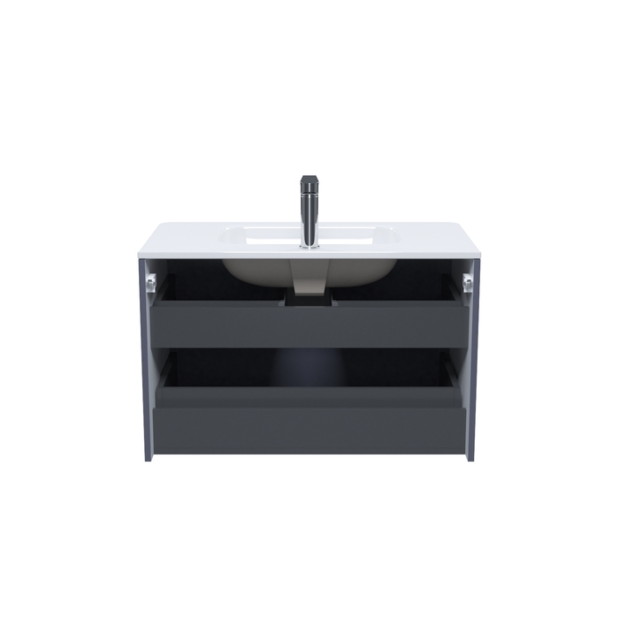 Два выдвижных ящика с механизмом плавного доведения. Пластиковый, серый ограничитель под сифон в верхнем ящике. Серые внутря: ящики, боковины. Навесы усиленные с планкой.